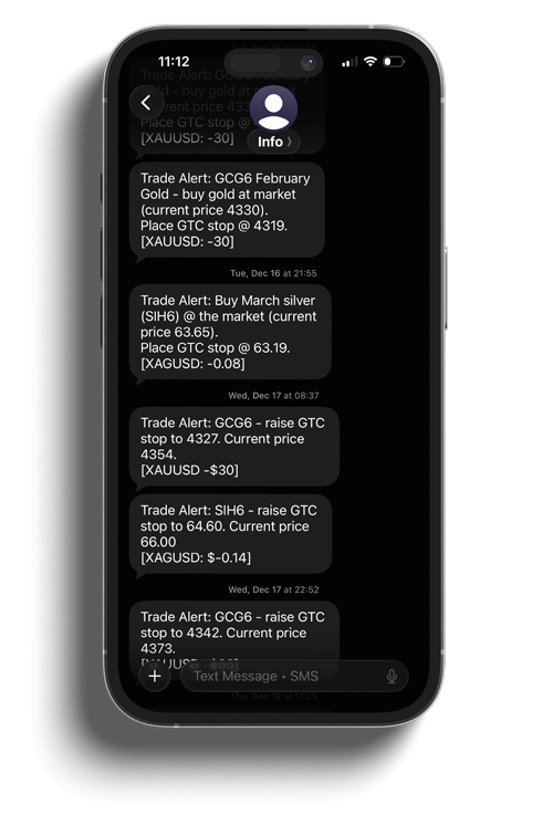 With our timely trade alerts sent via e-mail, text message (SMS), and Telegram App you won't miss an opportunity to make a trade. We offer Trade Alerts for Gold Futures (GC), XAUUSD (forex), Silver Futures (SI), XAGUSD.