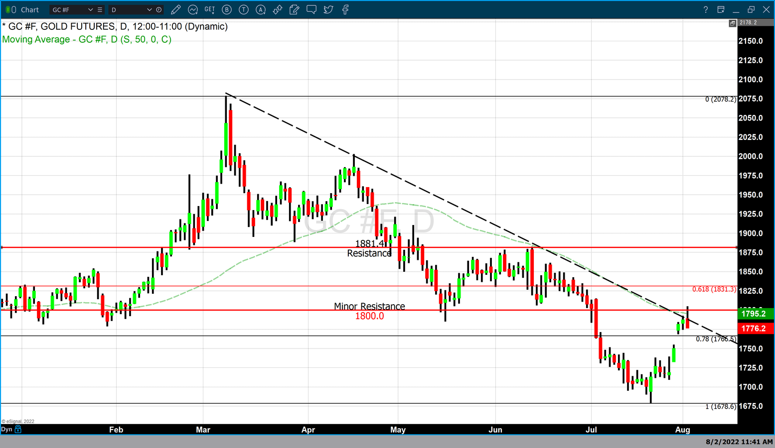 Gold briefly broke above $1800 trading to a high of $1805 today. However, these gains were short-lived, and gold retreated below $1800 and is currently just $0.20 above the low of $1776. In the case of gold, its 50-day moving average is defining the first level of resistance at $1795.20. The next level of resistance occurs at $1800 with major resistance at $1831.30 the 61.8% Fibonacci retracement.
