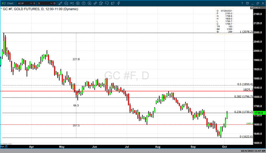 The chart above is a daily candlestick chart of gold futures. We have labeled potential areas of resistance based on a Fibonacci retracement and the identification of key tops in the market that could also be markers that could indicate resistance. The Fibonacci retracement data set begins at this year’s high of $2078 and ends at the low of $1621 that occurred five trading days ago. Currently gold is trading at $1734.70, and our technical studies indicate that the first potential level of resistance has just been passed at $1730.20 which is based on the 23.6% Fibonacci retracement. Above that price point, the first potential point of resistance should gold continues to move higher occurs at $1796.70. That is based upon the 38.2% Fibonacci retracement from the same data set. Lastly, there is potential resistance at $1825.10 which is the top that occurred in mid-August.