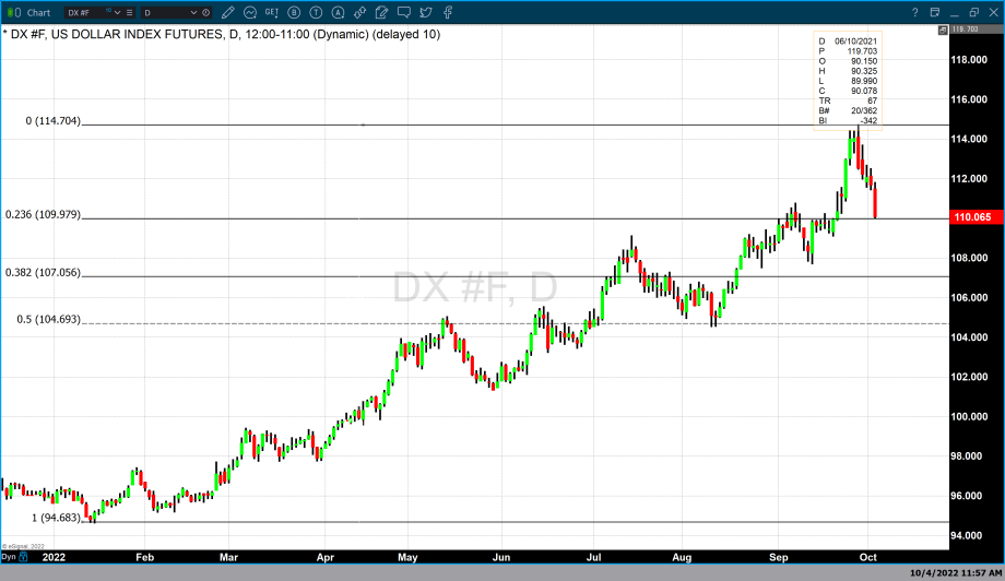 The chart above is a daily candlestick chart of the dollar index and a Fibonacci retracement data set. The data set begins in January of this year when the dollar index was trading at 94.683 and concludes at the recent high that occurred last Wednesday when the dollar index hit its highest value in the last 20 years at 114.704.