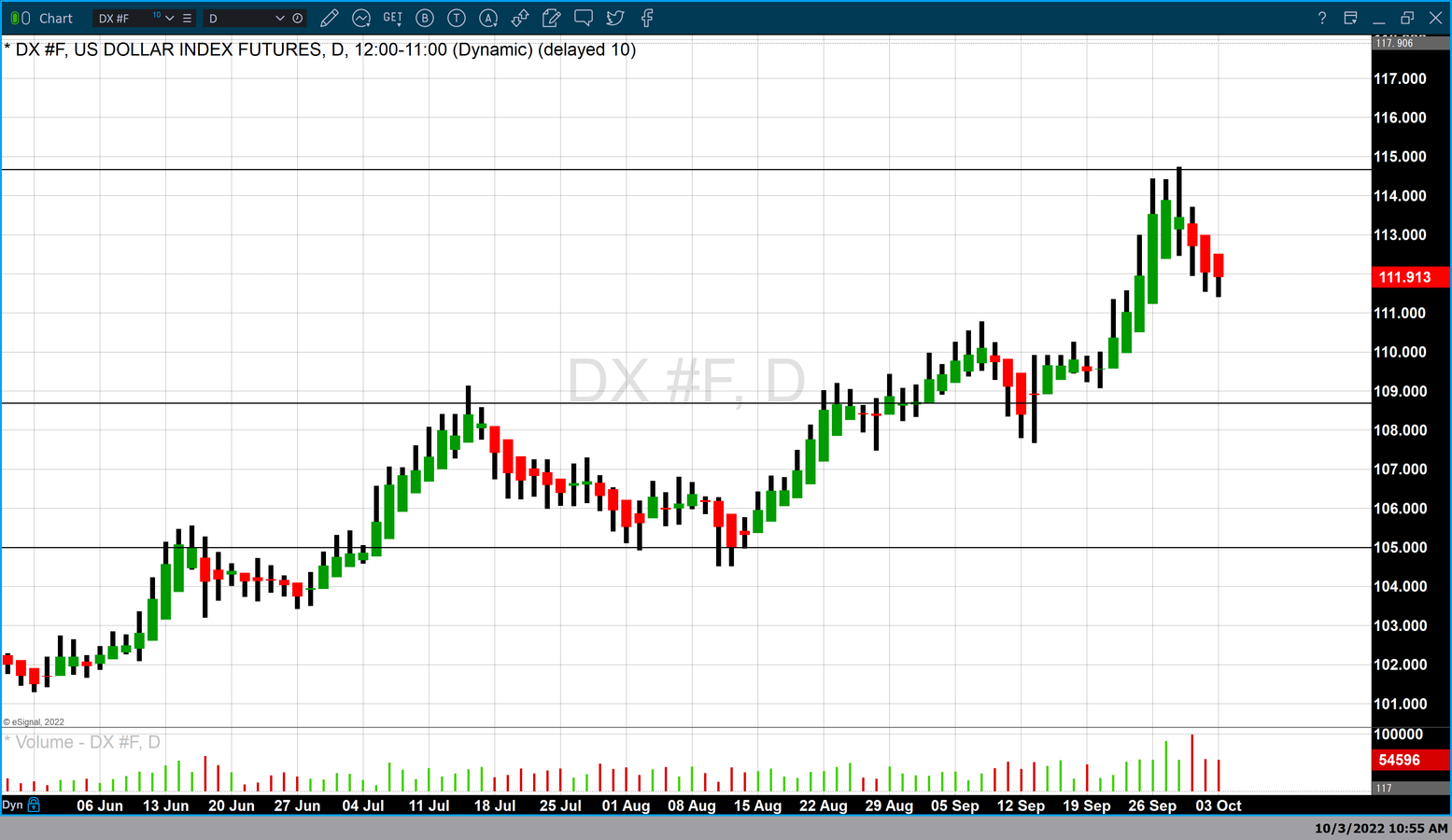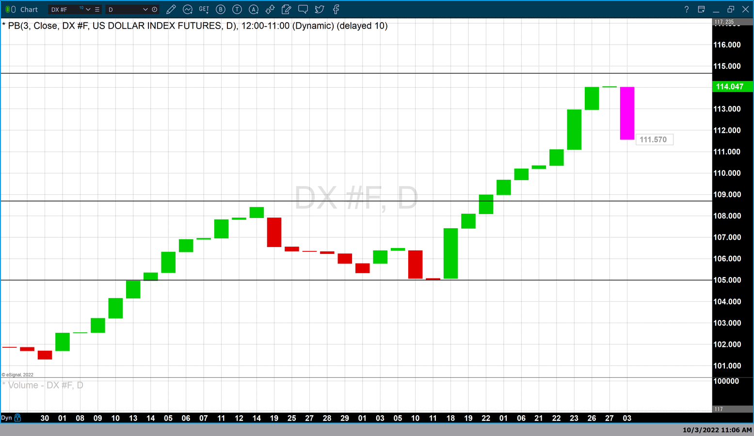 The chart above is a daily Japanese Heikin-Ashi chart of the dollar index. The Japanese Heikin-Ashi chart is a variation of a standard Japanese candlestick chart in that it uses the same four data points: open, high, low, and close. However, it is the open that is calculated differently than a standard bar or candlestick chart. In both of those charts, the open is fixed from the actual opening price of for that session. This creates the “real body” regardless of the color.