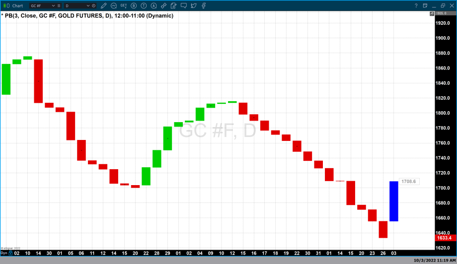 The shortcomings of both of these chart types are that during a choppy and range-bound market you will get alternating candle colors and no clear picture of the trend. Also, although it is clear that a key reversal has formed in both the dollar and gold, these trends can be short-term and reverse at any time as the fundamental events behind a rally or correction change.