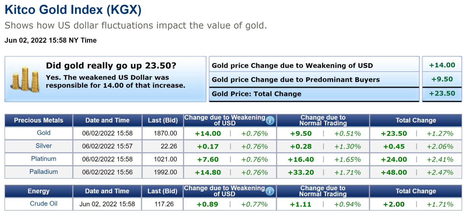 Today, we are seeing the exact opposite reflection with dollar weakness resulting in over half of the gains. As of 4 PM EDT spot gold is fixed at $1870 after factoring in a net gain of $23.50. According to the Kitco Gold Index (KGX), dollar weakness accounts for $14 of today’s move, and market participants bidding gold prices higher accounts for the remaining gain of $9.50.