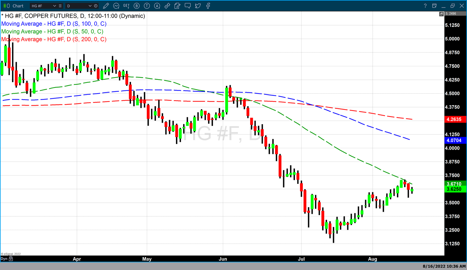 The chart above is a daily Japanese candlestick chart of copper futures. It is an excellent example of a market moving from bullish to bearish market sentiment. At the beginning of June market sentiment for copper, futures shifted. The three moving averages were in full bullish alignment in March, April, and May. However, in June and July, you could see market sentiment reverse with the 200-day MA above the 100-day MA before moving above the 50-day MA.