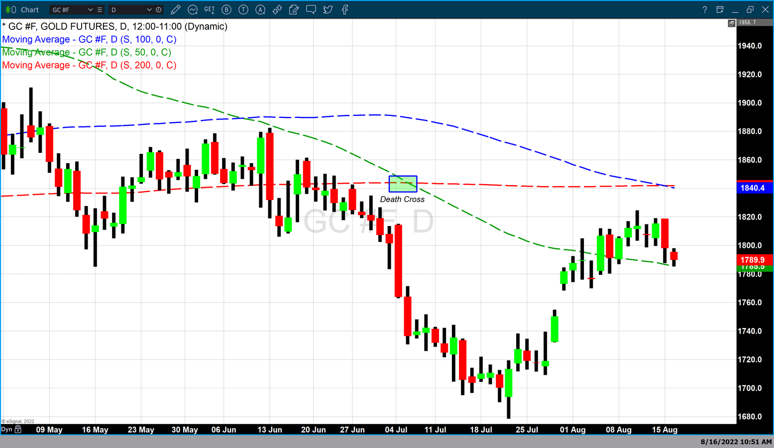 The last chart in today’s article is a daily Japanese candlestick chart of gold futures. It contains an excellent example of another way market technicians use multiple moving averages. When one moving average crosses below or above another time cycle it is considered significant. The example above shows the 50-day moving average crossing below the 200-day moving average at the beginning of July. This creates a pattern called a “death cross”. This pattern reflects recent price weakness as it refers to a drop of a short-term moving average below a longer-term cycle.