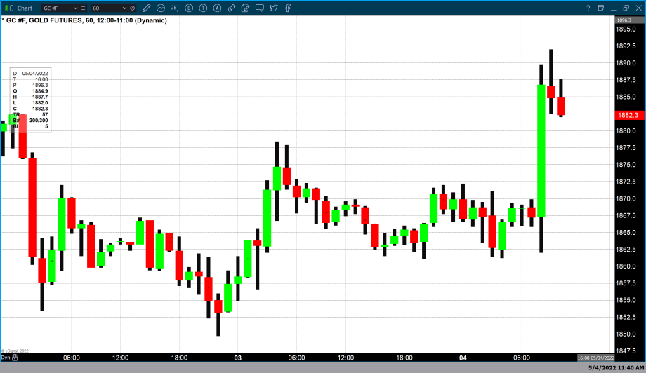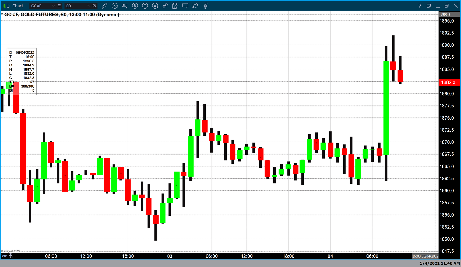 The net result of today’s FOMC meeting, the statement, and the press conference were extremely positive market sentiment for both U.S. equities and gold. As of 5:20 PM EDT gold futures basis, the most active June 2022 contract is up $11.70 or 0.63% and fixed at $1882.30. Gold futures are now trading back above the 100-day moving average.