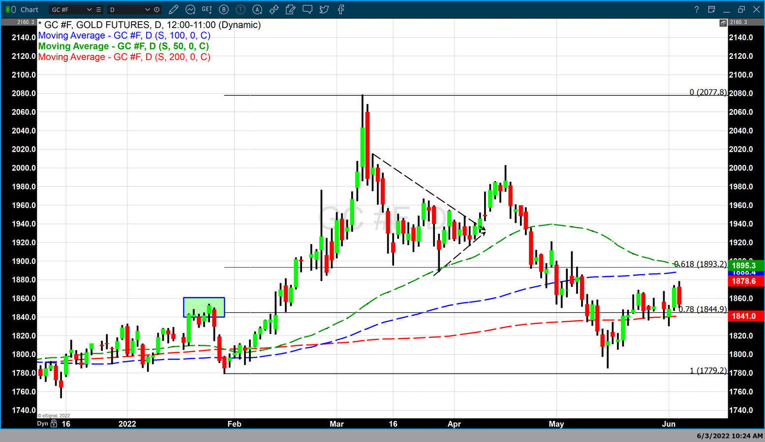 Today’s jobs report resulted in a strong price decline in gold as well as a nominal increase in the value of the dollar. As of 5:15 PM EDT gold futures basis, the most active August 2022 contract is currently fixed at $1853.90 after factoring in today’s decline of almost a full percent (-0.94%) or $17.50. Dollar strength was responsible for roughly 1/3 of today’s decline in gold prices. The dollar gained 0.35% taking the dollar index to 102.185.