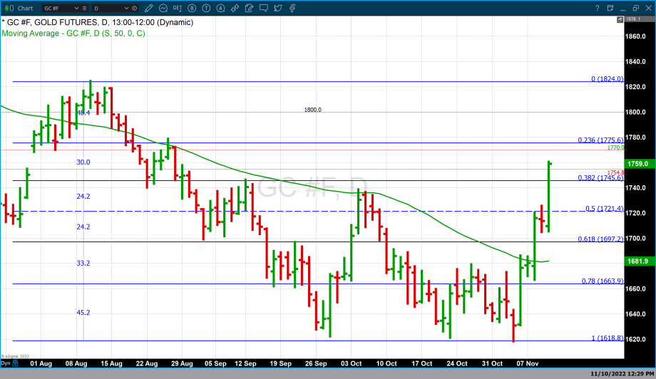 Today’s report immediately had a profound impact on market sentiment sending ripples through asset classes across-the-board. As of 4:15 PM EST gold futures basis, the most active December contract is trading at $1760 which is a gain of 2.71% or $46.50.