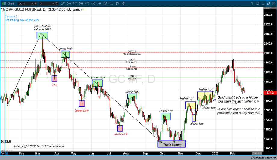 As of 5:10 PM EST, the most active April contract of gold futures is down $8.30 or 0.45% and fixed at $1834.20. Today’s decline effectively sealed the fate of gold’s strong price decline in February. Gold pricing is now below the opening price of January 3, the first trading day of the year.