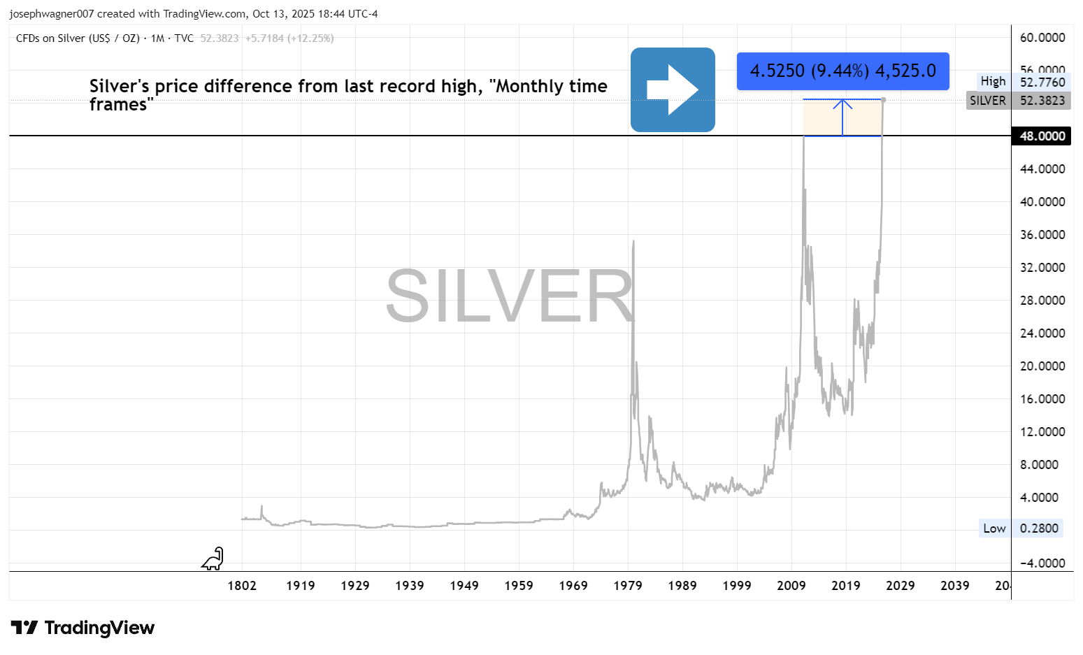 Silver futures are another story they have been on a tear since August but have not reached a new all-time high until Monday (intra-day on Wed.). Even more noteworthy is that backwardation in silver prices. Backwardation refers to spot prices being below futures prices, and is uncommon to see. Spot silver Made its new record last Thursday intra-day and Friday on a closing basis. Spot silver is now 5.18% above the previous record reached in 2011. Spot silver is now trading at $52.33 scoring its fifth new record high since the start of the month.