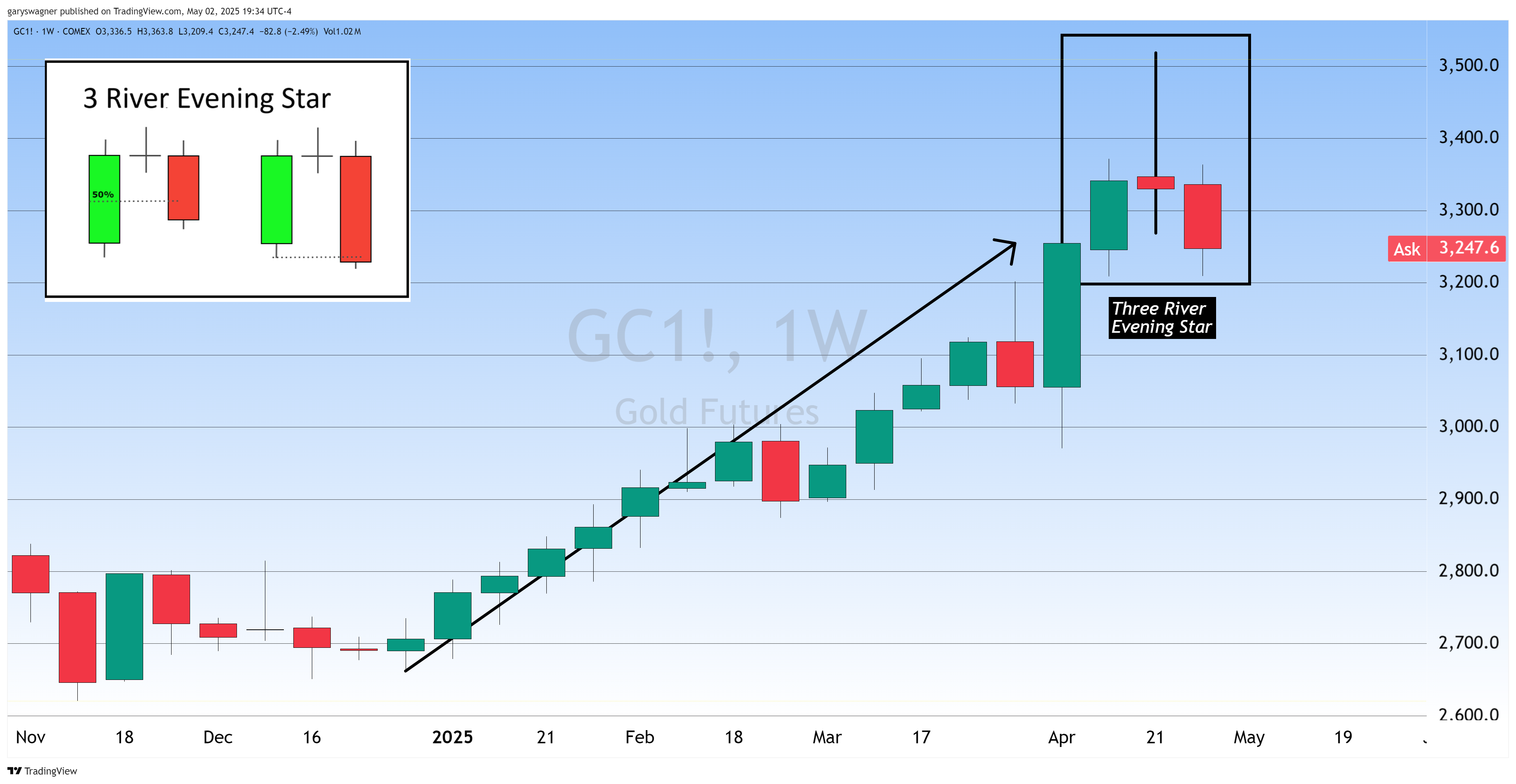 Collectively, these three trading weeks have formed what technicians call a "Three River Evening Star" pattern. This bearish reversal formation typically appears after a defined uptrend and consists of a large green candle, followed by a "star" (either a small spinning top or a doji), which is then followed by a large red candle with its body below the doji' body.