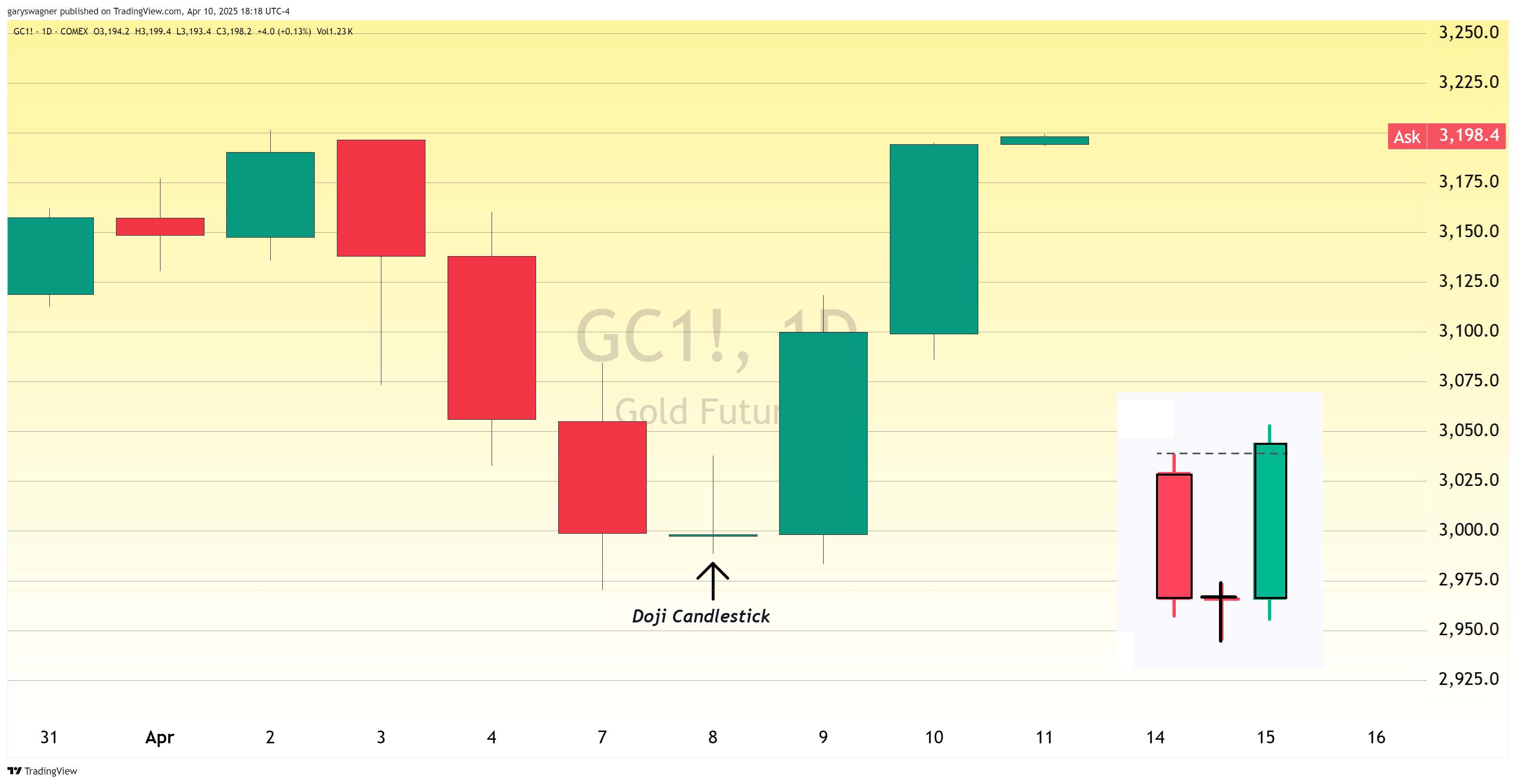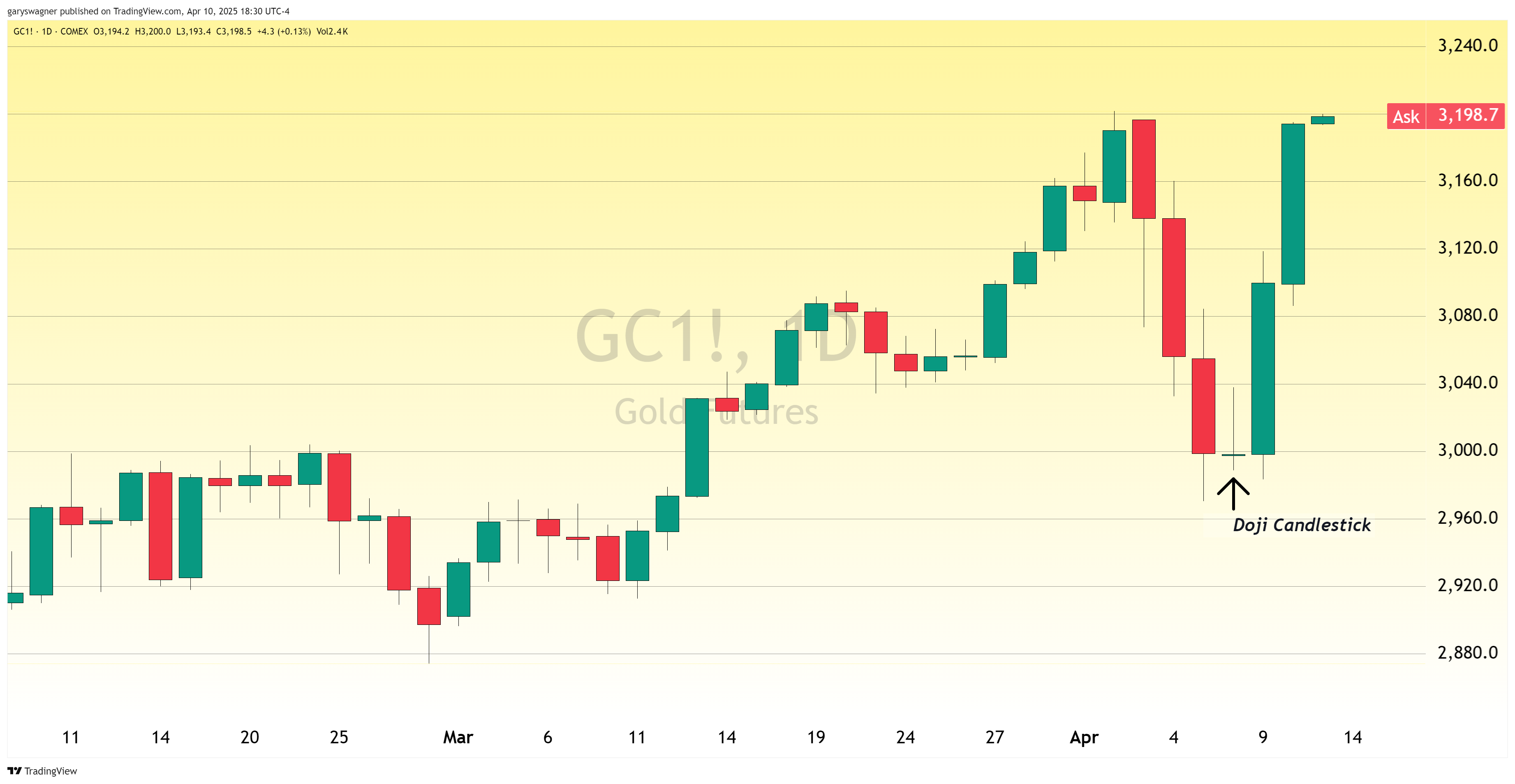 After reaching the former all-time record closing price of $3190.20 on Wednesday, April 2, gold futures opened at $3196.60 on Thursday April 3. However, it also marked the beginning of a steep and brutal price correction in which gold would decline by $134.50 on Monday, April 7. On Tuesday, April 8 those that utilize Eastern trading methodologies specifically Japanese candlestick identification immediately recognized the type of candlestick that formed on gold’s daily chart; a “Doji”.