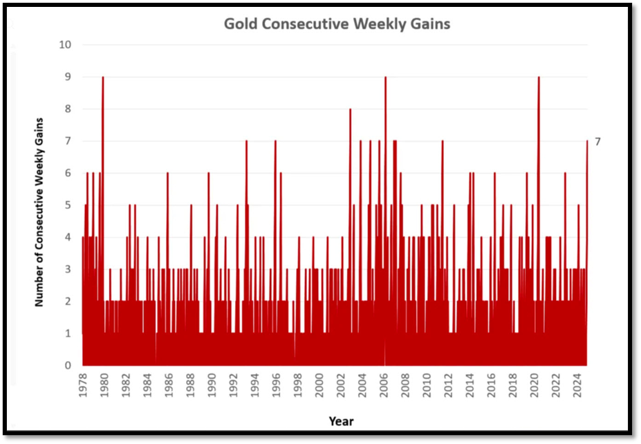 Historical data reveals an intriguing pattern regarding gold's performance following extended rallies. According to research compiled by 25-year financial analyst Eric L., returns following any winning streak of seven or more consecutive weeks tend to be negative, albeit only modestly so. His analysis of forward returns following these rare instances presents a sobering picture for near-term performance expectations.