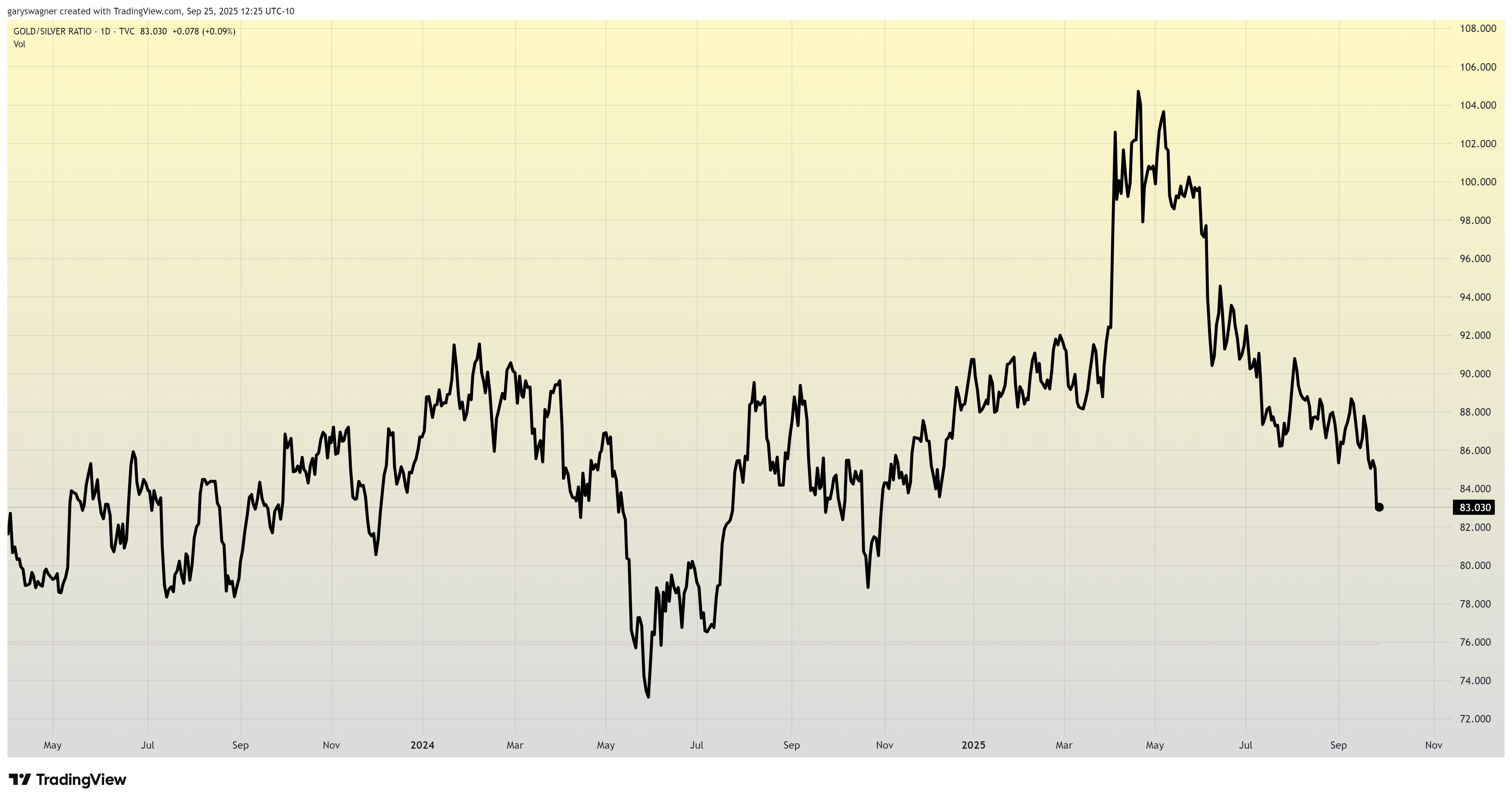 We have long been expecting silver to catch up to gold, and it recently has begun to close the gap. The gold/silver ratio dropped by 3% today now sitting at 82.89 closing at its lowest value so far in 2025. The ratio which compares how many ounces of silver are required to purchase an ounce of gold hit its lowest level on record back in 2011, during the last occurrence of silver breaking above $40.