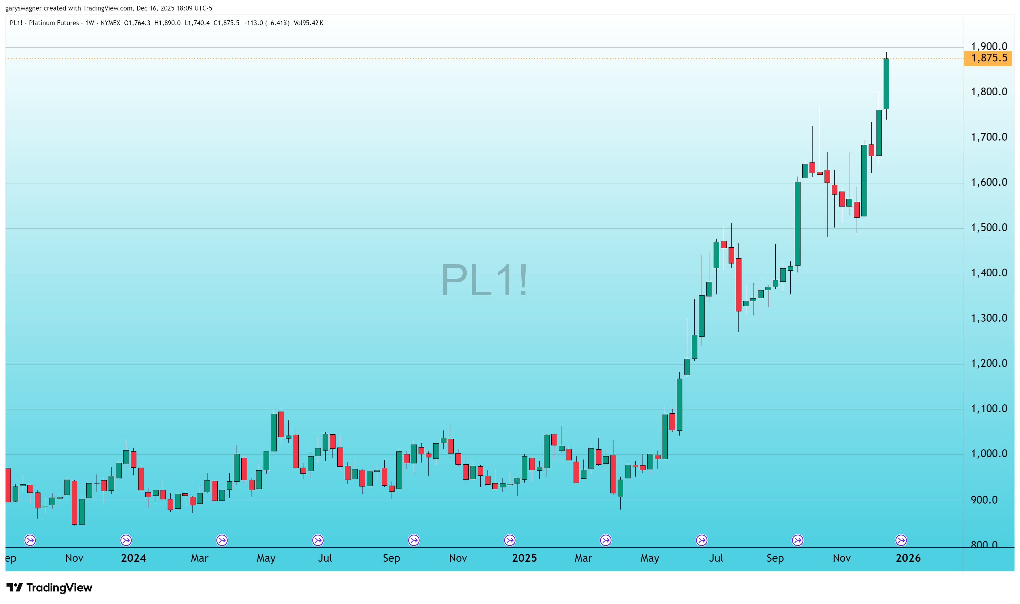 Platinum futures surged 3.22%, gaining $58.40 to trade at $1,874.30 per ounce. The industrial metal has broken out from its recent consolidation pattern, rallying sharply from the $1,500-$1,700 range that dominated trading through much of the fall. The move higher reflects both safe-haven demand and growing optimism about industrial demand, particularly from the automotive and chemical sectors.