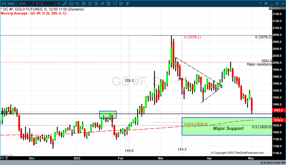 June 2022 gold futures opened this morning (4/29/2022) at $1895.80, far above yesterday’s low of $1871. Trading to a high of $1921.30 and settled in New York up 1.1% at $1911.70.