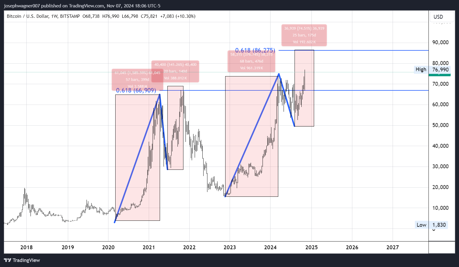 Using Fibonacci extensions, a key technical indicator that mapped the 2021 peak accurately, projects a year-end target of $86,275