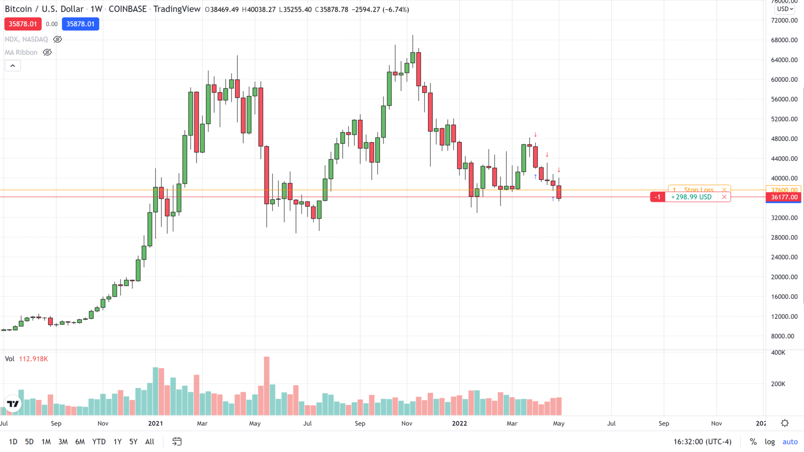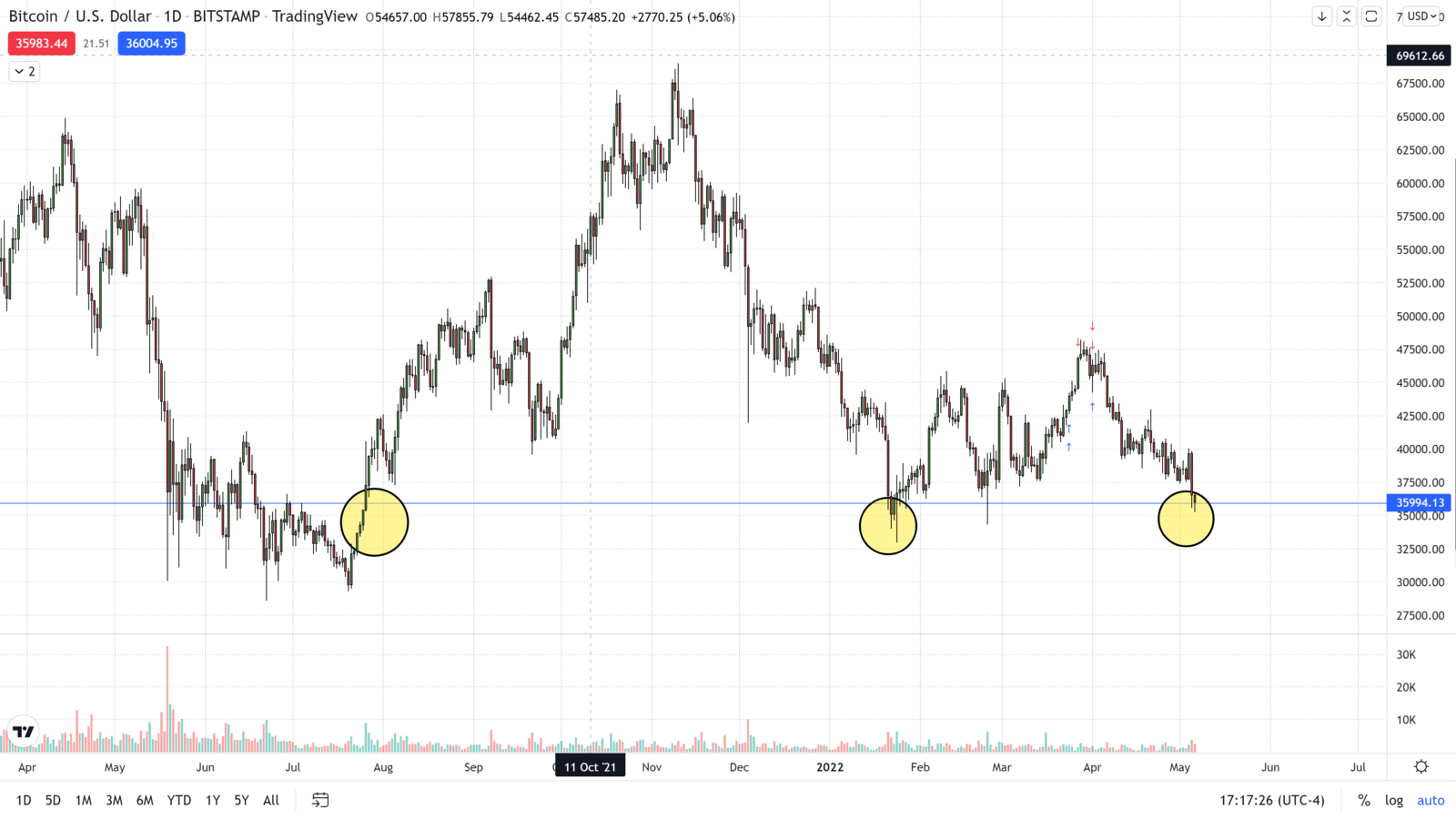 While on an intra-day basis we are only at a two-month low, on a closing basis if we close anywhere at or below current prices, we have only one day of pricing lower than current market print between now and July 25, 2021. That means that we are really closer to a 10-month low than a two-month low as we only have one closing price lower between the current market print and the lows of summer 2021 that reached as low as $29,000.