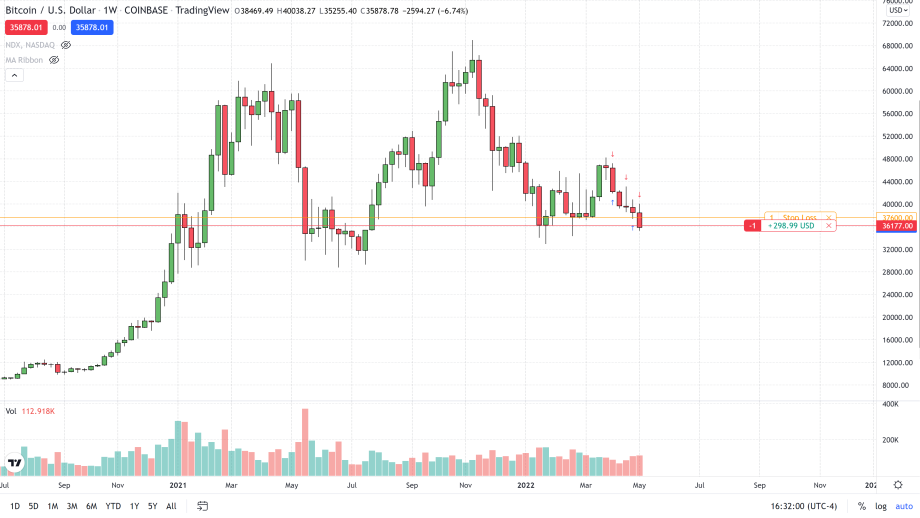 We are predicting lower prices ahead, with support levels at $33,000, and below that at $29,000. Resistance is being marked at $37,500, our old level of support, and $40,000 above that.