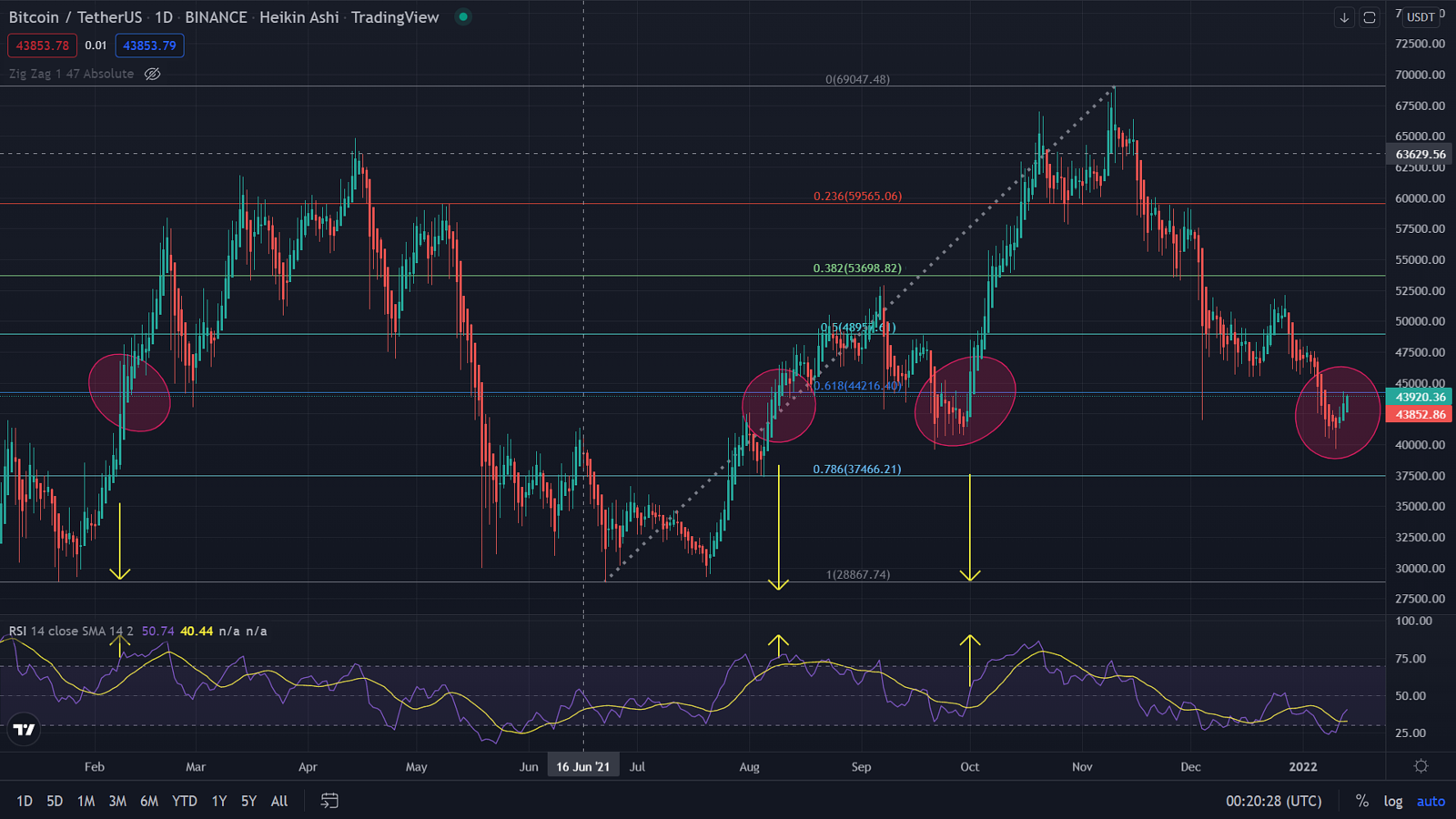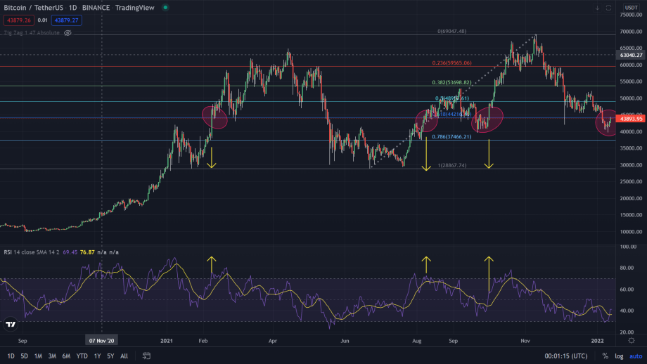 Of the three dates mentioned above (02.08, 08.21, 10.01), the most significant most parabolic move came on October 1st of last year pricing would rise by $9,000 in the three weeks. This occasion shares many criteria that define our current market such as trading below the level of $44k for approximately one week’s time and having an RSI that had just recovered from a local bottom.