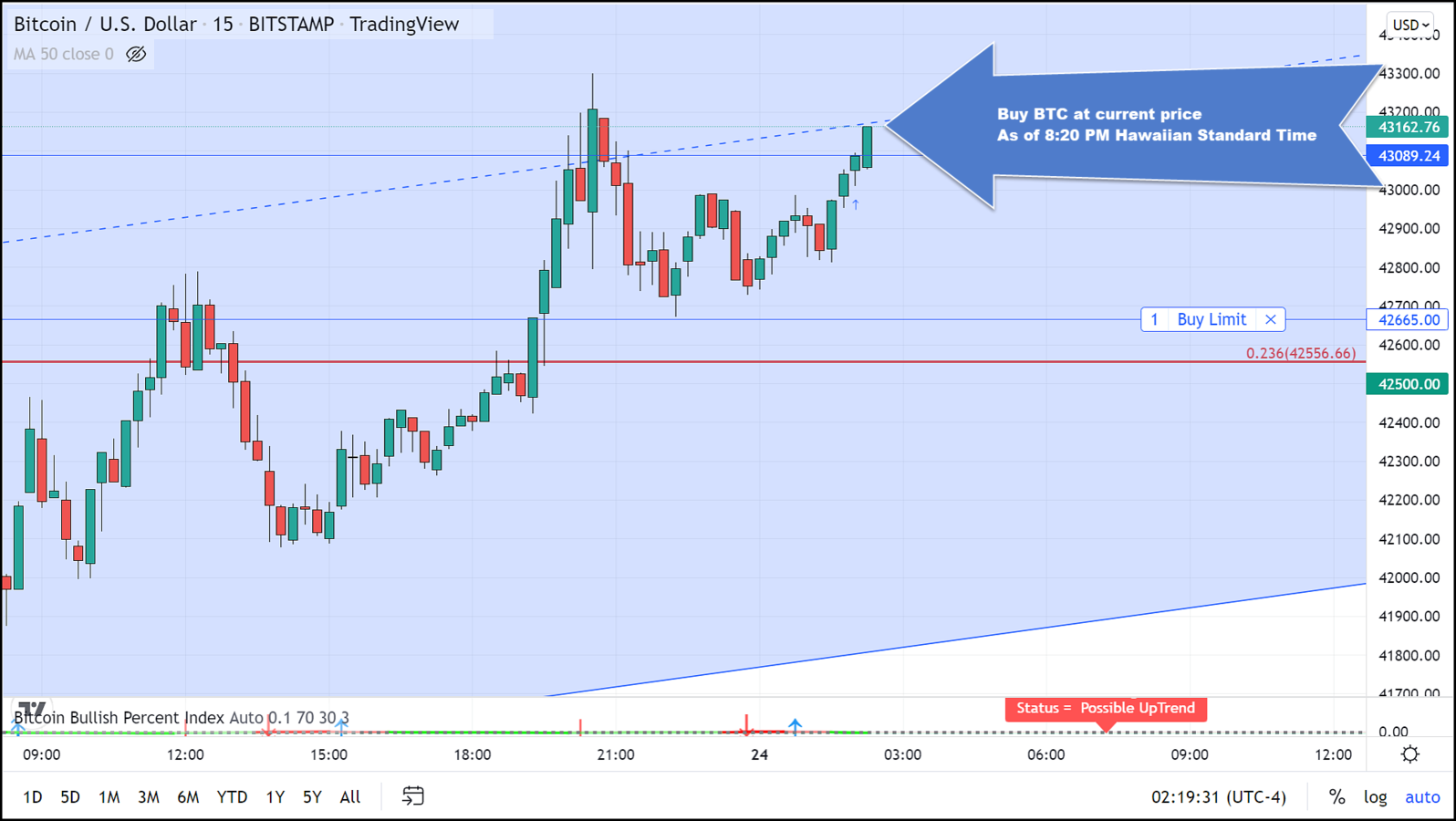We are recommending that traders enter a long position in BTC which as of 6:16 Eastern Daylight Time is trading around $43,000 on the spot markets. Place Protective stops at $42,600.