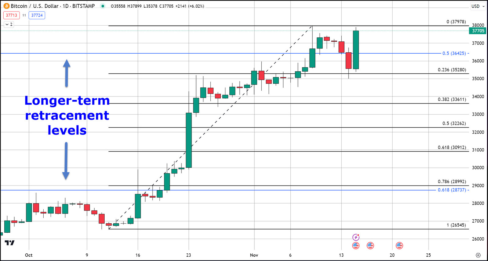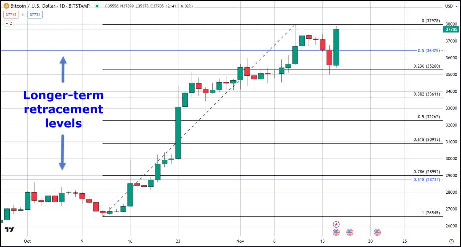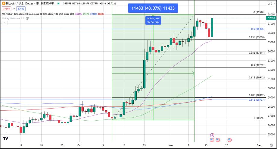 The recent decline in Bitcoin's value makes its chart full of strong technical indications, with bullish fundamentals still firmly in place the potential for the current rally to turn parabolic exists. Let us try to breakdown in order to comprehend the scale of the retracement and ongoing rally. Starting at $26,700 on October 12th, Bitcoin surged to an intra-day high of just below $38,000 in less than a month. This represents a substantial 43% gain in 28 days, with 32% occurring in the initial 12 days.