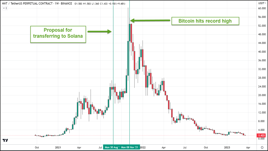 If 2021 was the landmark year for Helium then 2022 would be the landslide year. A lot of changes were implemented that were supposed to boost the speed of the network by adding validators which were overpriced nodes that would begin to earn all the consensus rewards for the network. This year they also added light hotspots to the network, both additions were supposed to increase the speed and limit congestion in the fast-growing network. However, the blockchain was still undergoing constant halts and slowdowns and the validators appeared to be nothing more than a cash grab by Nova Labs. Then later in the year it was announced that helium would be taking the network off its own blockchain and migrating to Solana the first proposal of this Helium improvement protocol (HIP) 70 was first proposed at the end of August 2022. The stated reason was because even with the addition of validators and light hotspots the Helium blockchain was far from smooth, fast, and cheap and was encountering bugs on a almost monthly basis. By the end of 2021 HNT was worth around $1.70. With the addition of 22 new manufacturers for Helium hotspots and the loss of consensus rewards the amount of HNT earned by these hotspots came down considerably in 2022.
