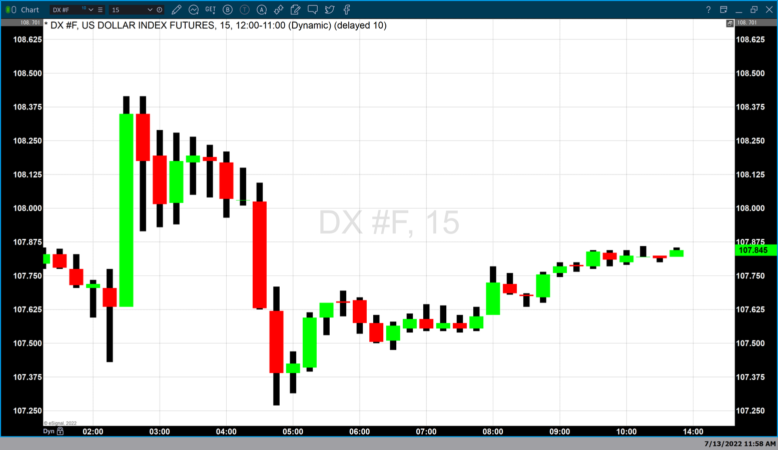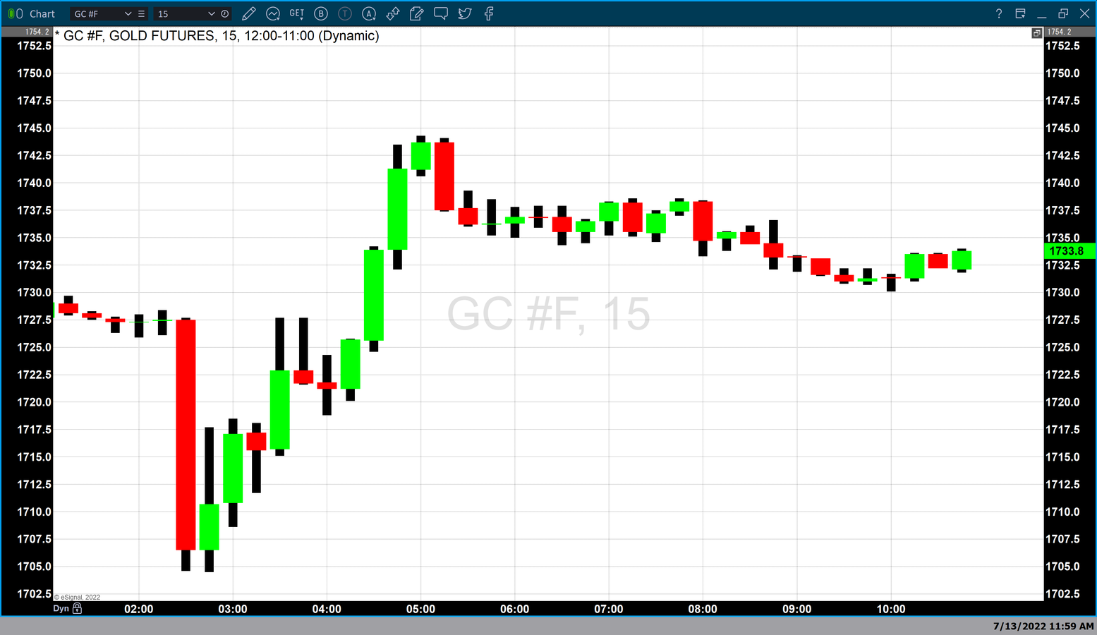 This created extreme volatility in both the dollar and gold. The chart above is a 15-minute candlestick chart of gold futures. The CPI report was released at the same time gold trading opens in New York at 8:30 AM EDT. Gold opened at $1723.60 and dropped to the intraday low of $1704.50 within the first 15 minutes of trading. It would take gold a full two and a half hours to reach today’s high of $1744.30 and then decline fractionally in price. As of 5:53 PM EDT gold futures basis, the most active August contract is fixed at $1733.80 after factoring in a nine-dollar gain.