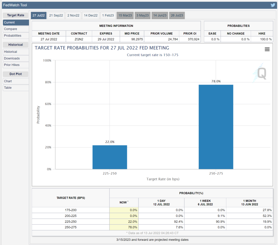 That being said, the Federal Reserve is on track for a much larger rate hike than anticipated yesterday. Yesterday the CME’s FedWatch tool said that there was a 92.4% probability that the Federal Reserve would raise rates by 75 basis points and a 7.6% probability that the Federal Reserve would raise rates by 100 basis points at the next FOMC meeting on July 26 -27. Today the FedWatch tool is predicting that the probability of a 75-basis points rate hike this month is 22%, with a 78% probability that they will raise rates a full percentage point or 100 basis points.