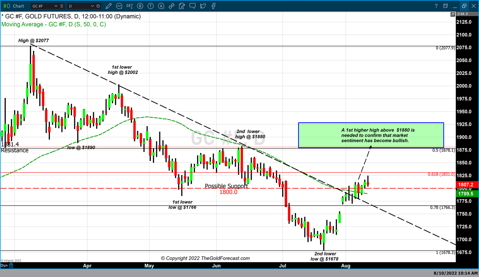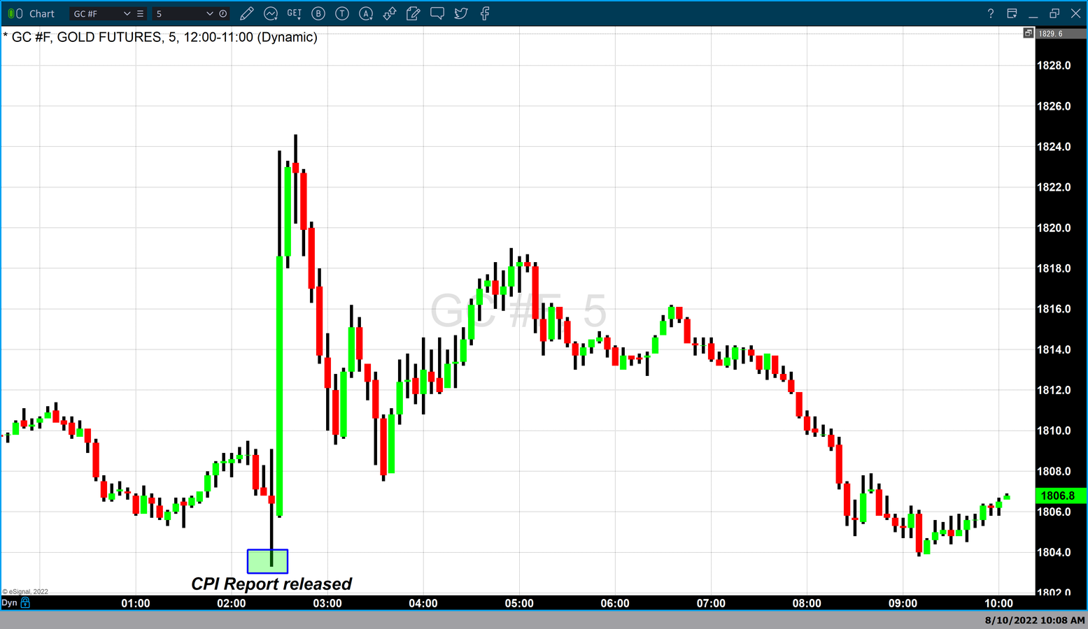 Today’s report created extreme volatility in both the dollar and gold during the first twenty minutes immediately following its release. The knee-jerk reaction moved gold extremely higher. Gold futures opened at $1811.50 in New York, the exact time that the report was released. Fifteen minutes later gold would trade to $1824.60 today’s high. However, those gains were short-lived and as of 4:37 PM EDT, the December contract is currently down $4.70 and fixed at $1807.60, $3.90 below today’s New York open. The chart above is a five-minute candlestick chart of gold futures that clearly shows the extreme volatility during the first twenty minutes, and the methodical price decline evident during the remainder of the trading session in New York and Globex.