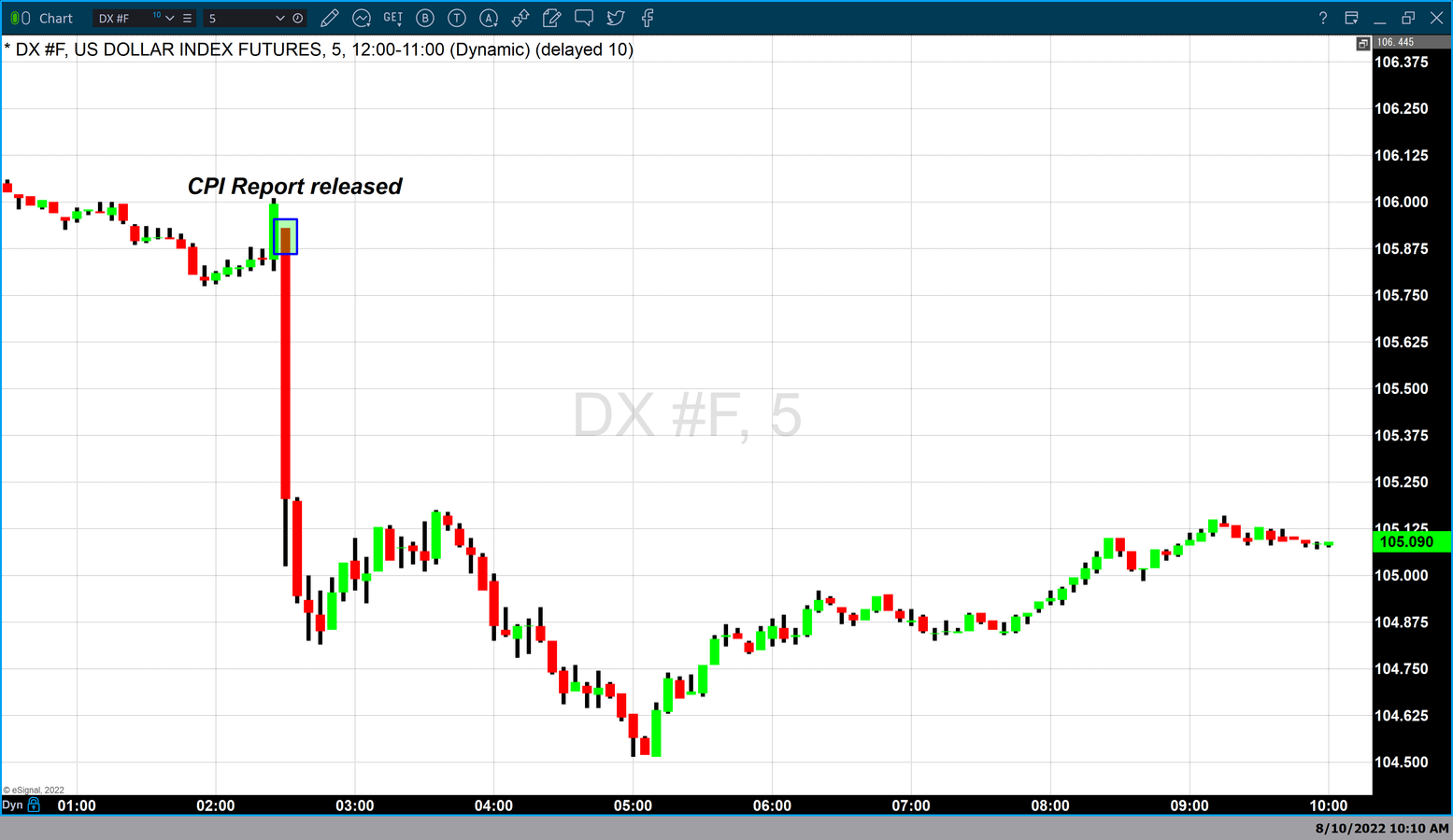 The dollar also had an extremely volatile knee-jerk reaction to today’s report. The dollar index opened at 106.22 and traded to today’s daily low of 104.515 by 11:30 AM EDT. As of 4:52 PM EDT, the dollar index is currently at 105.12 after factoring in today’s decline of 1.07%.