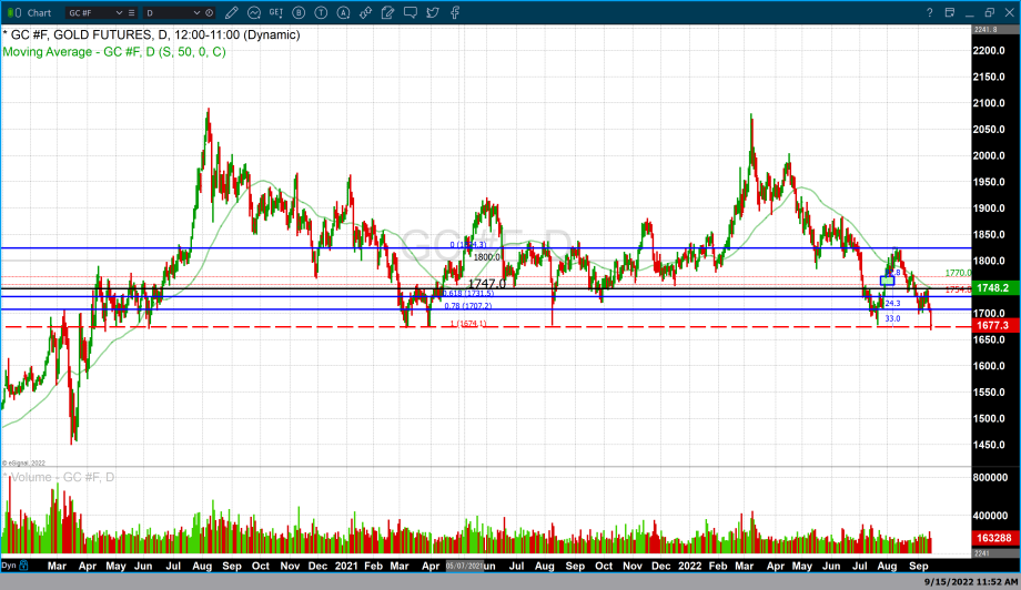 As of 5:45 PM EDT gold futures basis, the most active December contract is down $35.20 a decline of over 2% and fixed at $1673.90. This is a major break below a critical level that was formerly supported. In tomorrow’s article, we will look at the technical levels that gold could trade to if it continues to move south. I had