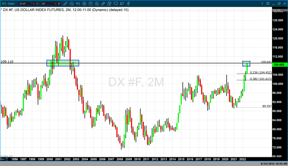 The chart above is a two-month Japanese candlestick chart of the dollar index. It identifies the last two times the dollar has traded to this value. The first occurrence was in 2000 when the dollar index broke above 109 and traded to a high of approximately 120. The second instance was during the correction that occurred immediately after hitting 120 in 2003.