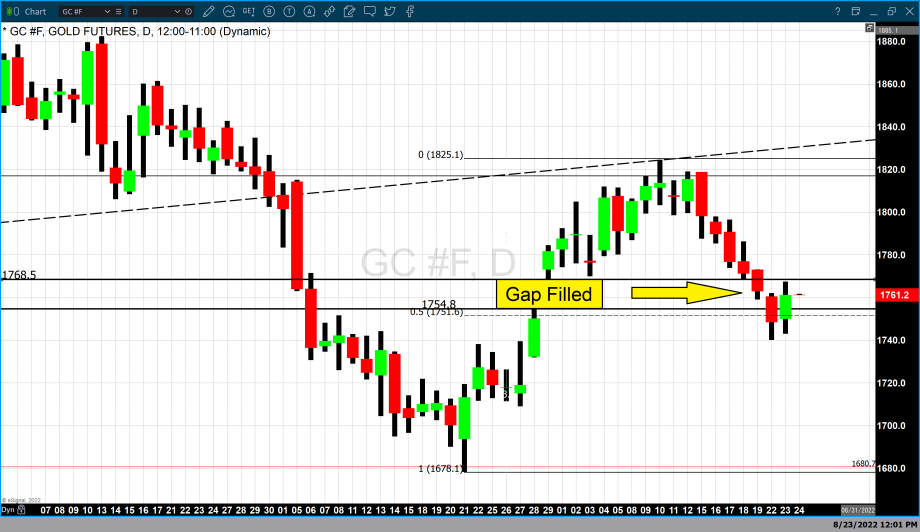 The chart above is a daily Japanese candlestick chart of gold futures. As of 5:45 PM EDT, the most active December 2022 contract is fixed at $1761.10 after factoring in today’s gain of $12.70 or 0.73%. The dollar index declined by 0.47% today which means that it accounted for roughly half of the gains in gold with the remaining gains directly attributable to market participants bidding the precious yellow metal higher.