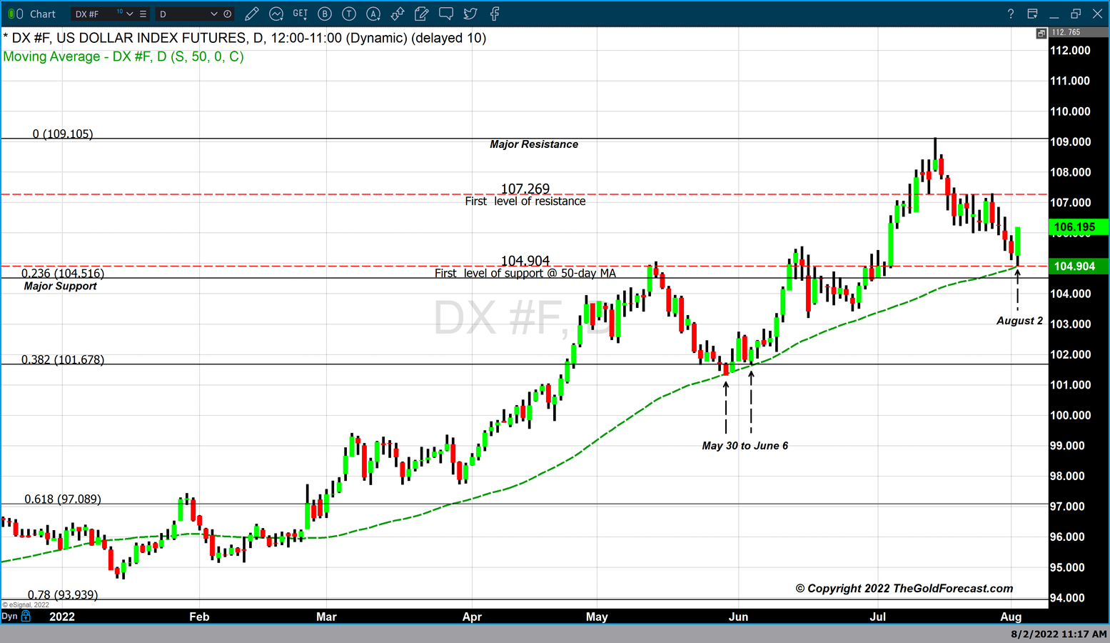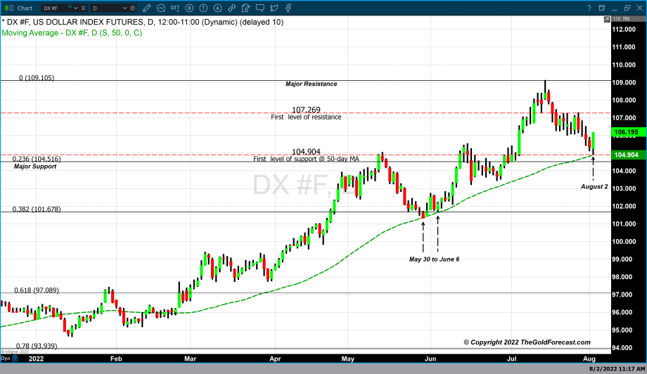 The first occurrence happened on the week of May 30 to June 6, between those two dates gold hit upon the 50-day M.A. and bounced upward from 50-day M.A. confirming technical support. The second instance occurred in trading today with the dollar index trading just 0.016 points above the 50-day M.A.