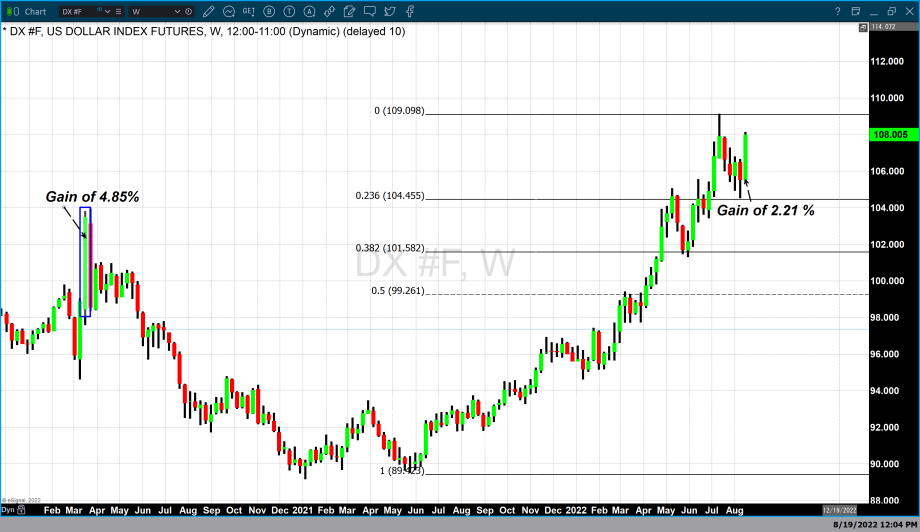 On the other hand, the gains this week in the dollar index are rare and I believe extremely significant. In terms of percentage advance, gold did experience a larger percentage drop than the dollar gained. The weekly advance for the dollar index is 2.217%. However, to identify the last instance the dollar declined this deep in a single week occurred during the week of March 16, 2020, well over two years ago. In a single week, the dollar index opened at 98.46 and closed at 103.48, a strong price advance of 502 points which is a weekly gain of 4.851% more than double this week’s gain.