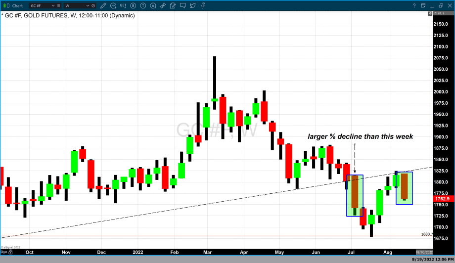 This is significant but certainly not extremely rare. Historically speaking we can easily identify weeks in which gold had a significant drawdown greater than this week’s price decline. Only five weeks ago, during the week of July 4 gold sustained a weekly drawdown of $71. This represents a weekly price decline of 3.861%.