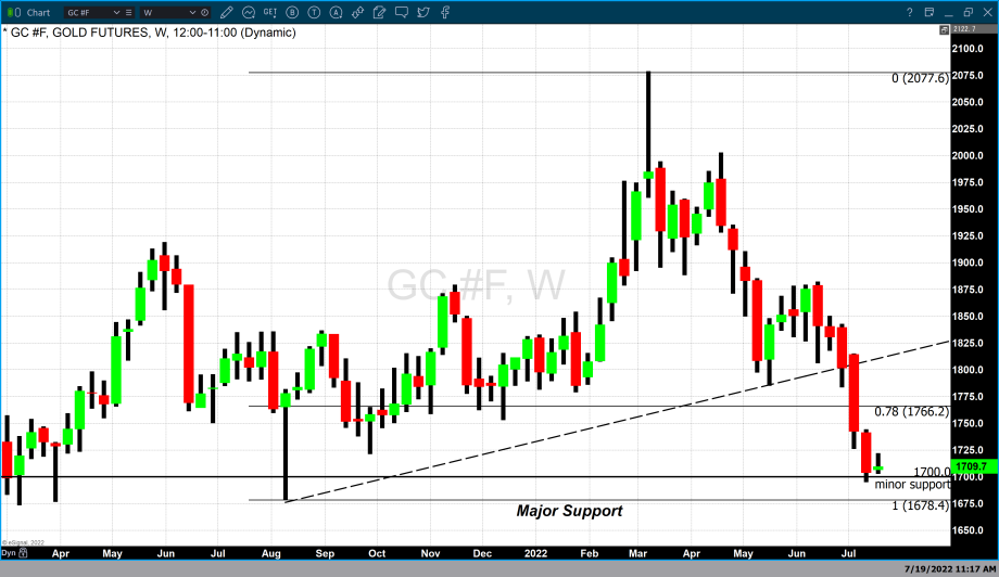 Even with extreme dollar weakness gold has diminished in value from the opening price on Thursday, July 14 to the current price of gold futures which is $1710. The differential between the opening price on Thursday to current pricing results in a loss of approximately $23 or -1.32%.