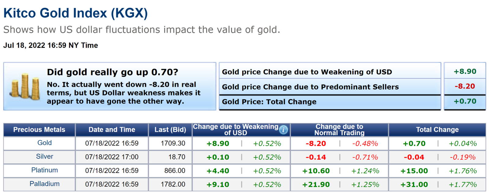 This can also be seen in spot gold pricing which is currently fixed at $1709.30. On closer inspection dollar weakness added $8.90 per ounce and traders bid the precious metal lower by $8.20 resulting in a net gain of $0.70. This is according to the Kitco Gold Index.