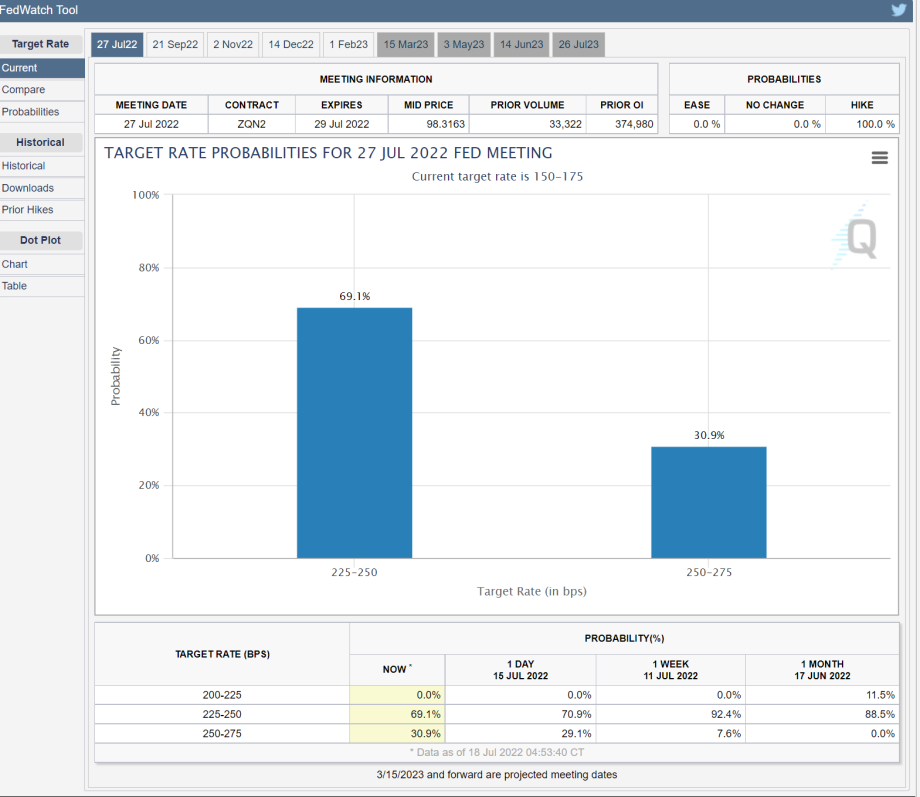 After last week’s CPI index report for June was released market participants began to factor in the possibility that the next rate hike during this month’s FOMC meeting ending in July 27could be as high as a full hundred basis points.