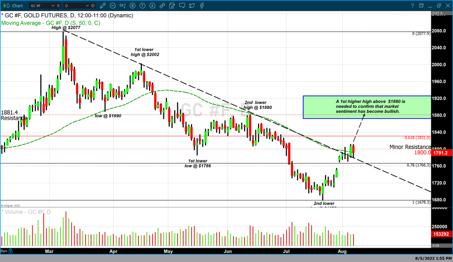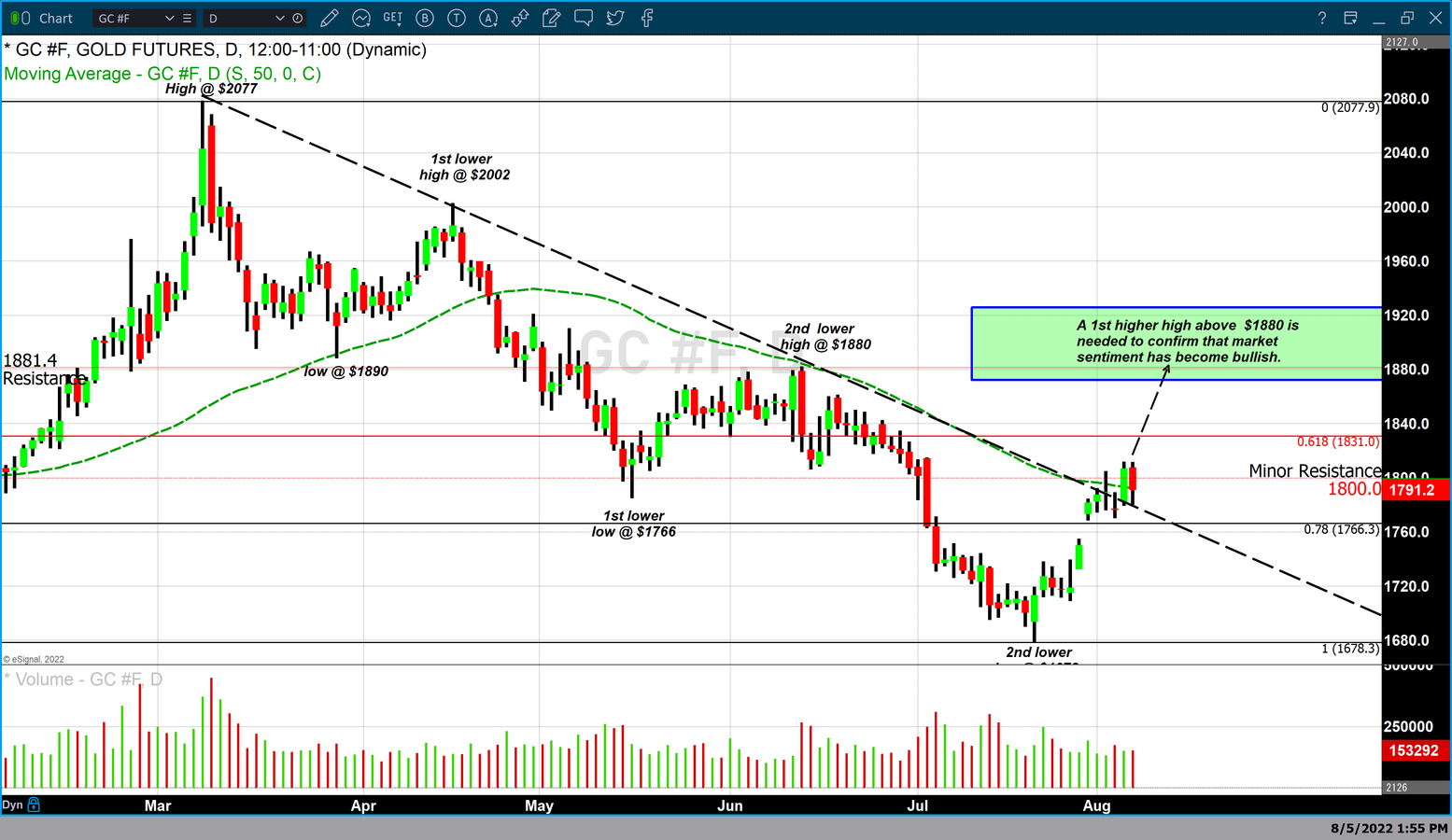 Gold futures closed above $1800 yesterday and the 50-day moving average was significant, however, very short-lived. It is also less likely that we will see gold recover quickly in that today’s jobs report strengthens the resolve of the Federal Reserve to raise rates by another 75 basis points in September. This will also be highly supportive of the U.S. dollar as we saw in trading today.