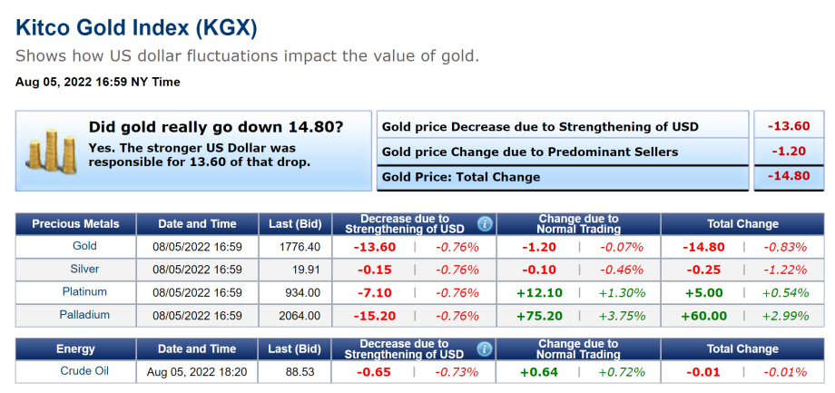 Spot or physical gold lost $15.57 and is currently fixed at $1776.40 according to the Kitco Gold Index. On closer inspection, the KGX reveals that $13.60 of today’s decline of was a direct result of dollar strength, and a fractional decline of $1.20 was the result of traders bidding gold fractionally lower.