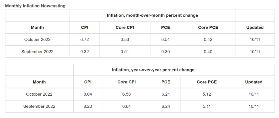 The bottom line is that the likelihood of a 75-basis point rate hike in November remains elevated at 78.4%. Realize that the Federal Reserve is not waiting on data from the CPI report on Thursday. This is because the Federal Reserve bank of Cleveland is using a modeling system using current data today data called “Inflation Nowcasting”.