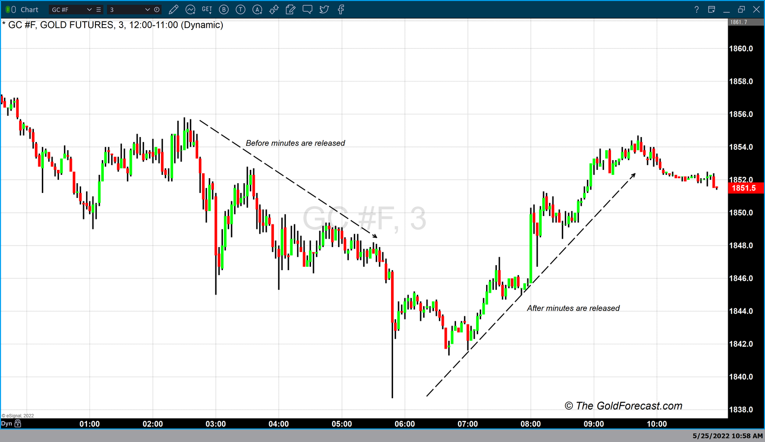 It was the minutes released today that caused gold futures to close lower; As of 4:55 PM, EDT gold futures are currently down $13.10 or 0.70% and fixed at $1852.30. The chart above is a three-minute Japanese candlestick chart of gold futures. This short 3-minute chart magnifies the quickness and dramatic price swings that occurred today.