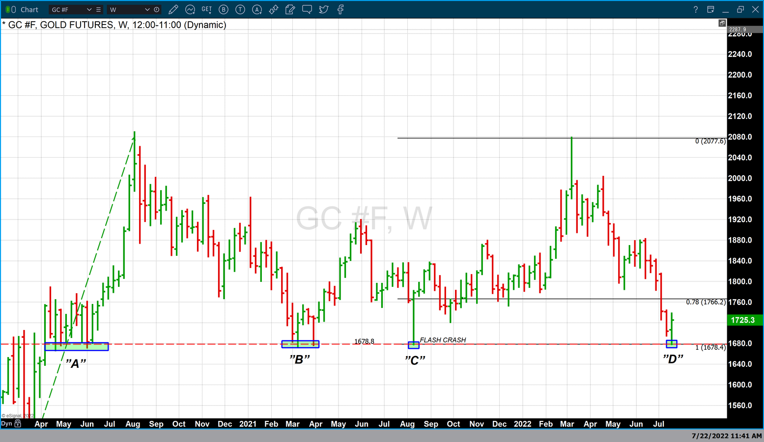On deeper inspection gold has found support at this price point on several occasions. Besides the flash crash on August 9, and yesterday’s low there are two other instances when this price point proved to be a technical level of support. The chart above is a weekly bar chart of gold futures. It highlights specific times that we can identify $1678 as a support level.