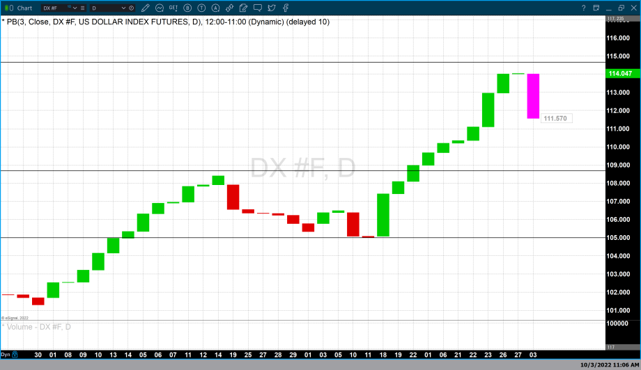 Today US treasury notes declined by 0.87 points moving the yields from 3.829% to 3.642%. When yields on U.S. debt instruments rise it moves the dollar higher, which also means that when yields decline so does the dollar. That is exactly what we saw today with the dollar declining by 0.45% a total of 0.504 points with the dollar index currently fixed at 111.58. Last week on Wednesday, September 28 the dollar hit its highest value in the last 20 years at approximately 114.60. The dollar index has closed lower on three of the last four trading days.