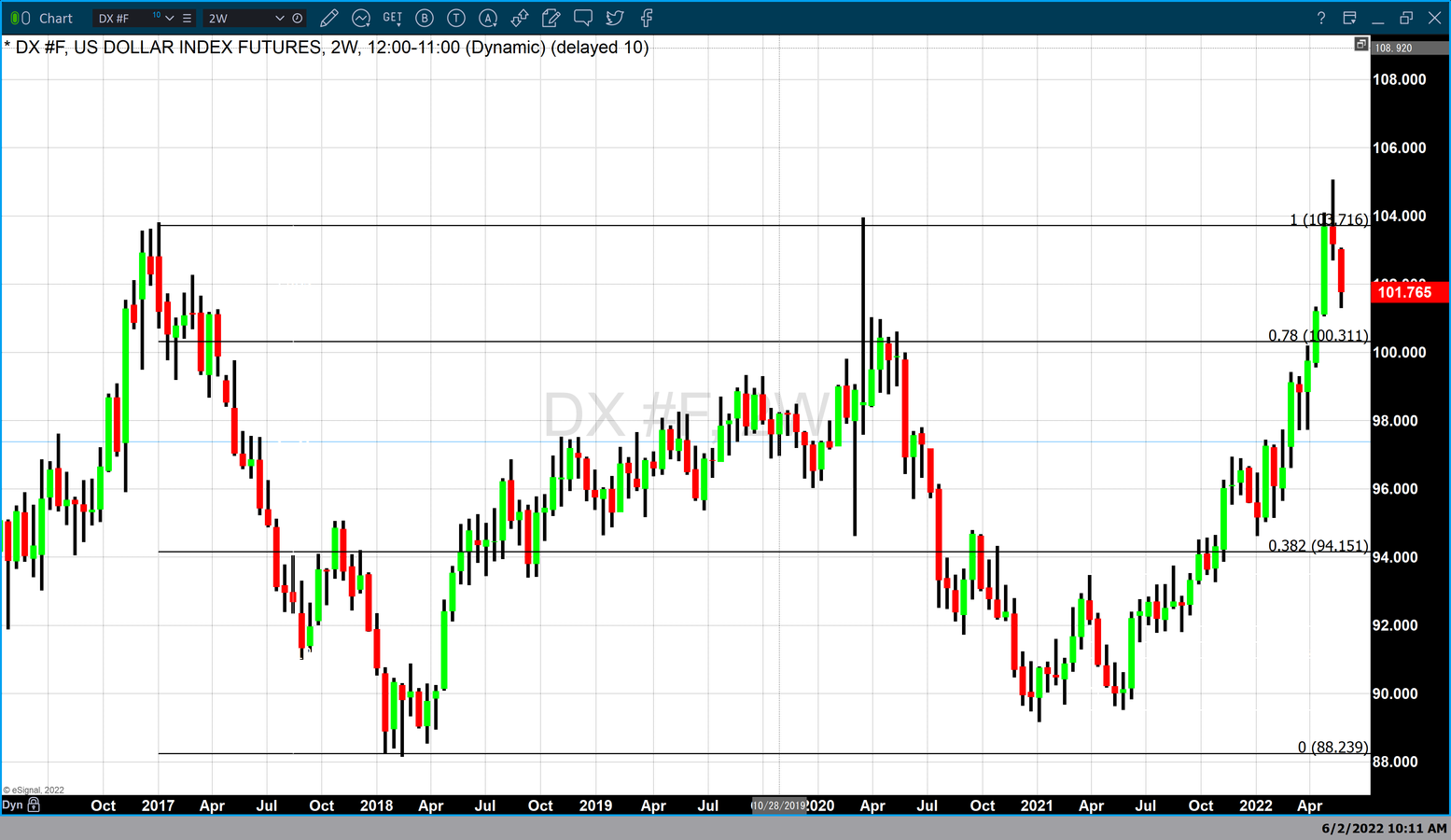 Just as in the top that occurred in 2017 what followed in 2020 was a price correction that lasted approximately a year and ½ resulting in a decline in dollar value of approximately 15%. In other words, historically speaking the dollar tends to have extended periods of strength and extended periods of weakness. The latest top that was achieved in the dollar index in which for the third time since 2017 the dollar index hit a top or apex between 103 and 105. As of today, the dollar index has declined from 105 to 101.76.