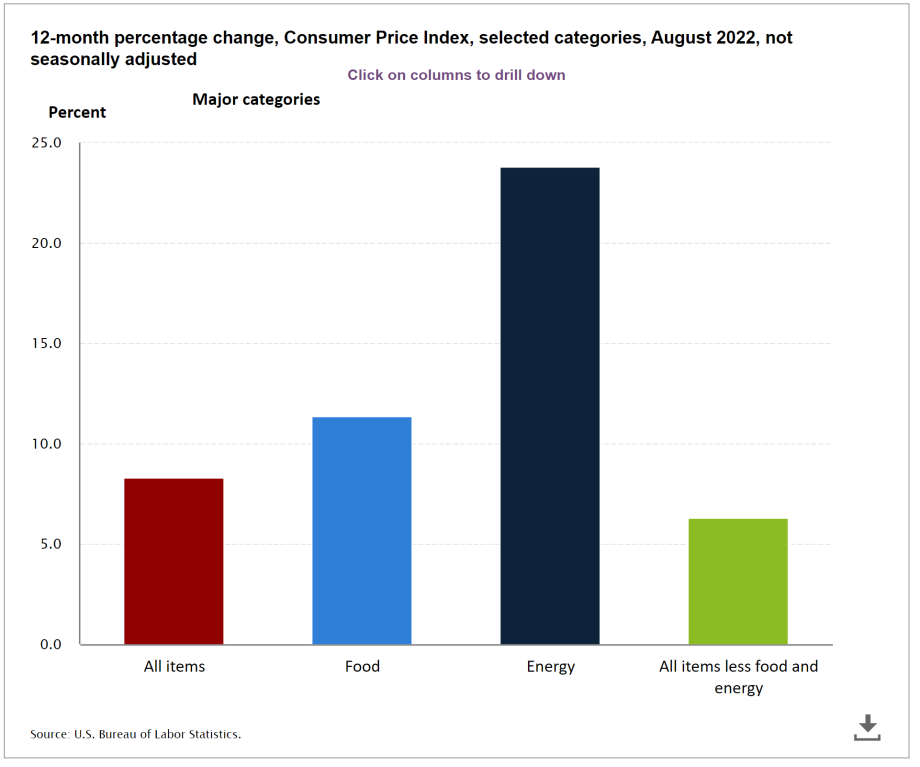 According to the BLS, “Over that period, prices for food at home increased 13.5 percent, the largest 12-month percentage increase since the period ending March 1979. Food prices away from home increased 8.0 percent for the year ended August 2022, the largest over-the-year percentage increase since an 8.4-percent increase in October 1981.”