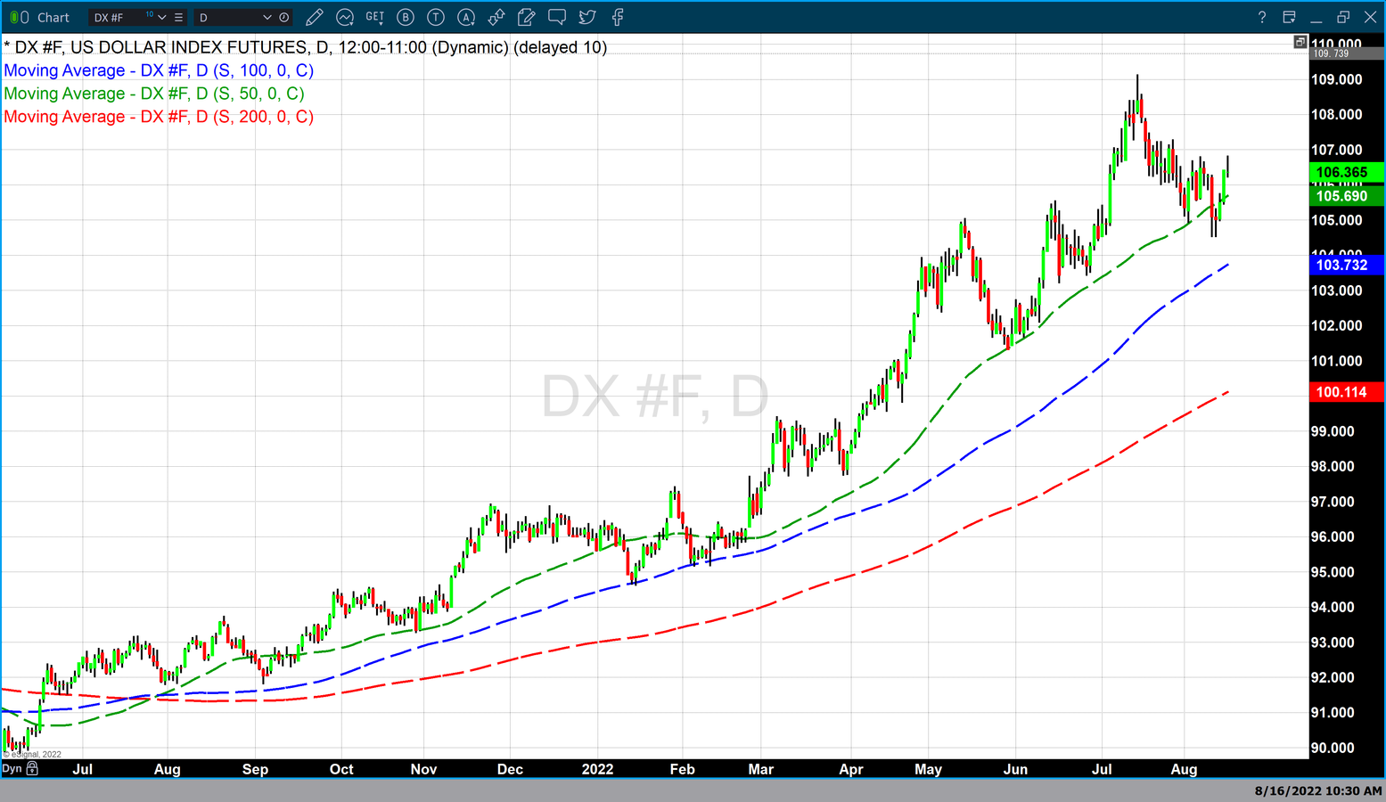 The chart above is a daily Japanese candlestick chart of the dollar with three moving averages plotted (50 in green,100 in blue, and 200-day in red). It is an excellent example of a market that is in a strong bullish uptrend. In August 2021 the dollar index based on these three moving averages came into full bullish alignment. The strength of an uptrend can be visually determined by the distance between each of the moving averages. As long as the averages are in full bullish alignment, and the bullish trend is gaining strength, the distance between the three averages will continue to widen.