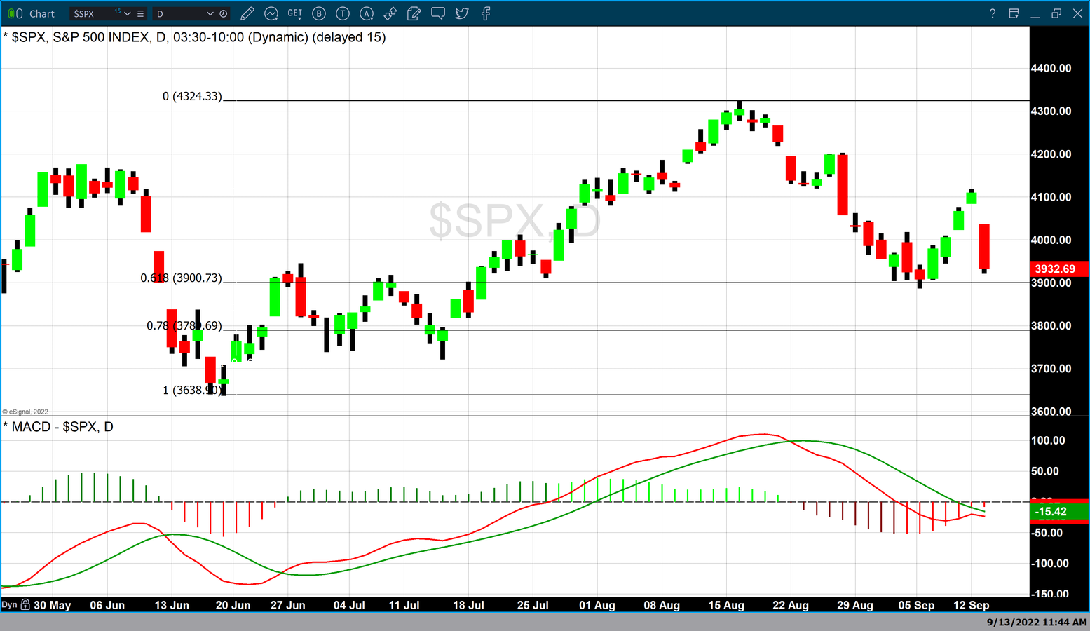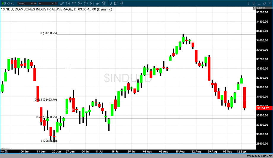 Today the Dow gapped below the entire trading range of Tuesday opening at 32,000, trading to a low of 31,104.97, and closing very near the low at 31,104.97. The S&P 500 had a steeper decline giving up 4.32% or 177.72 points, with the largest percentage decline occurring in the Nasdaq composite which lost 5.16%.